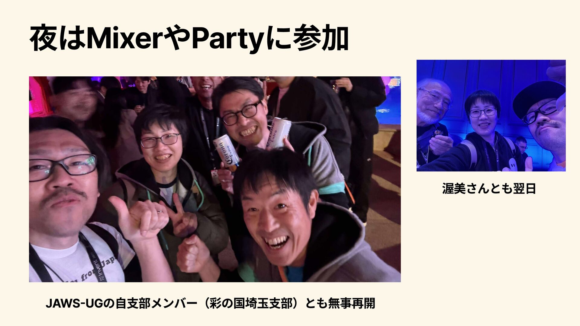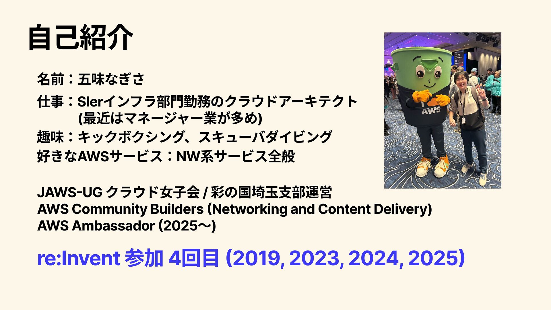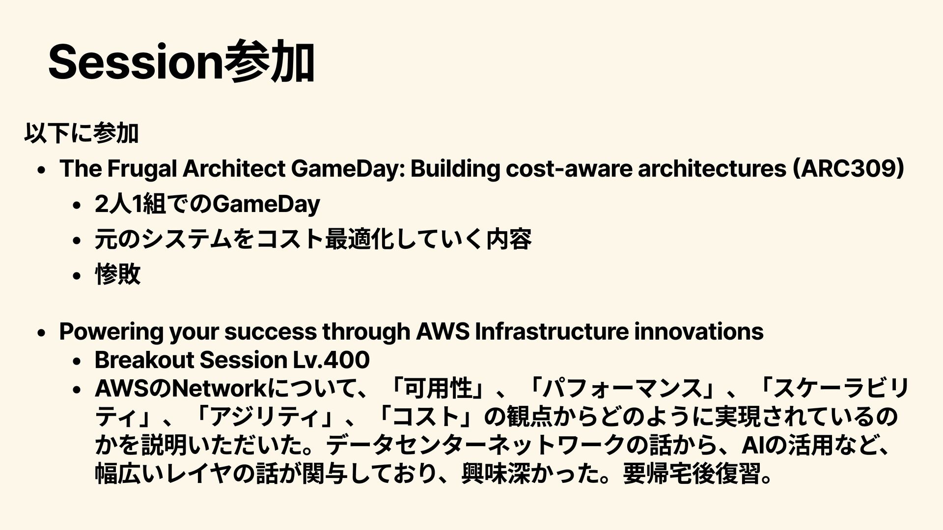 2人1組でのGameDay 元のシステムをコスト最適化していく内容 惨敗 Powering your success through AWS Infrastructure innovations Breakout Session Lv.400 AWSのNetworkについて、「可用性」、「パフォーマンス」、「スケーラビリ ティ」、「アジリティ」、「コスト」の観点からどのように実現されているの かを説明いただいた。データセンターネットワークの話から、AIの活用など、 幅広いレイヤの話が関与しており、興味深かった。要帰宅後復習。