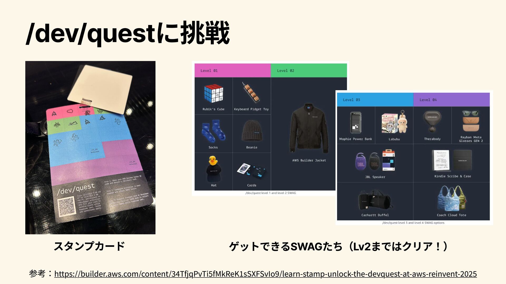 Fortinet (GHJ302) 4人1組でのJAM セキュリティ系の内容 74チーム中6位で全問解けたのでまずまずか... Elastic Load Balancing cookbook: Advanced recipes for ALB and NLB Chalk Talk Lv.300 ALB/NLBの最近のアップデートについて説明&質疑 質問はできなかったのですが、ALB/NLBのアップデートについての掘り下げた質疑