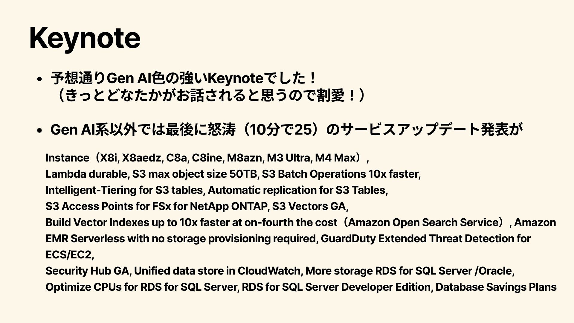 (きっとどなたかがお話されると思うので割愛!) Gen AI系以外では最後に怒涛(10分で25)のサービスアップデート発表が Instance(X8i, X8aedz, C8a, C8ine,