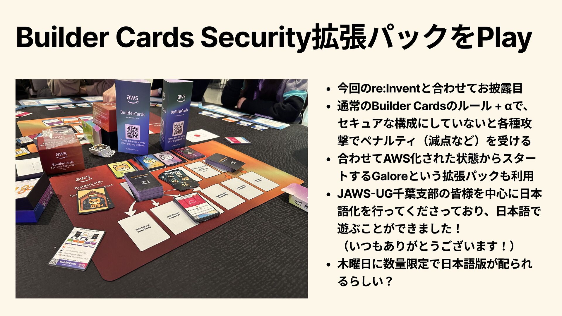1. Builder Cards Security拡張パックをPlay 今回のre:Inventと合わせてお披露目 通常のBuilder Cardsのルール + αで、 セキュアな構成にしていないと各種攻 撃でペナルティ(減点など)を受ける