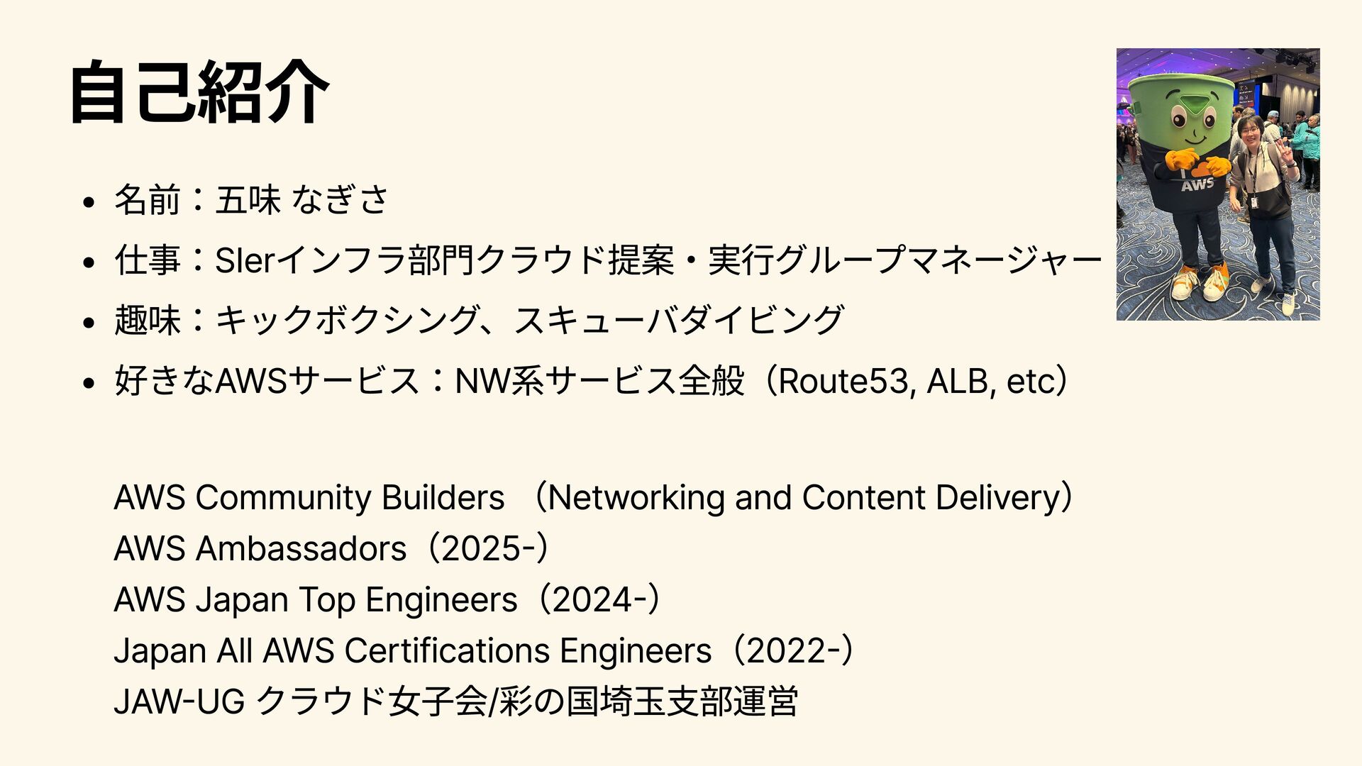 自己紹介 名前:五味 なぎさ 仕事:SIerインフラ部門クラウド提案・実行グループマネージャー 趣味:キックボクシング、スキューバダイビング 好きなAWSサービス:NW系サービス全般(Route53, ALB, etc) AWS Community