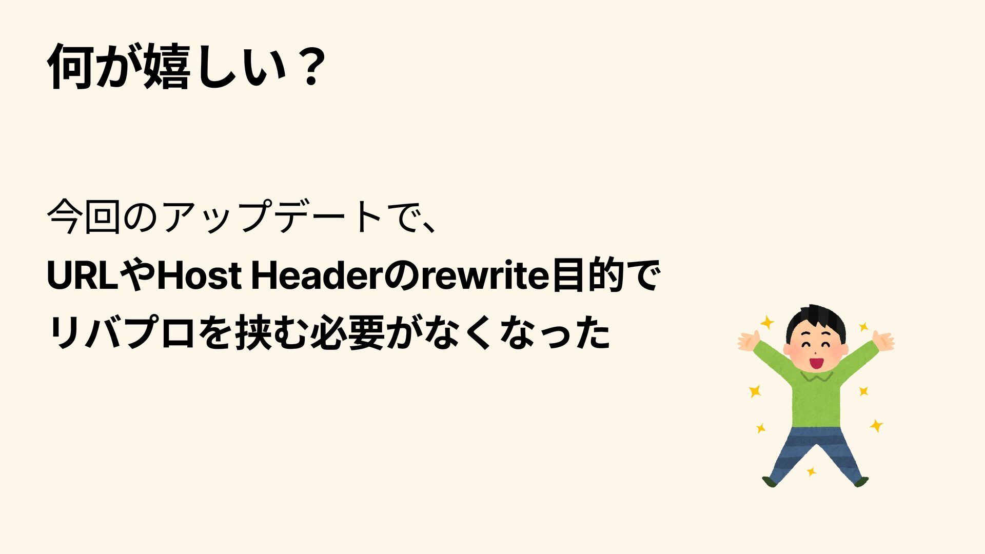 何が嬉しい? 今回のアップデートで、 URLやHost Headerのrewrite目的で リバプロを挟む必要がなくなった