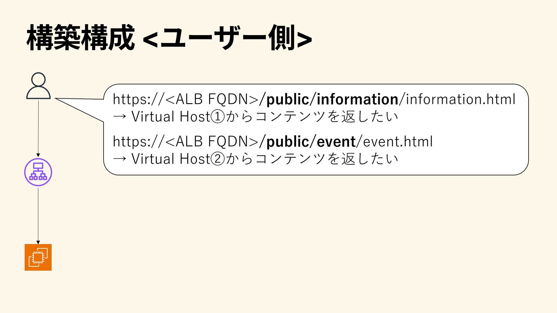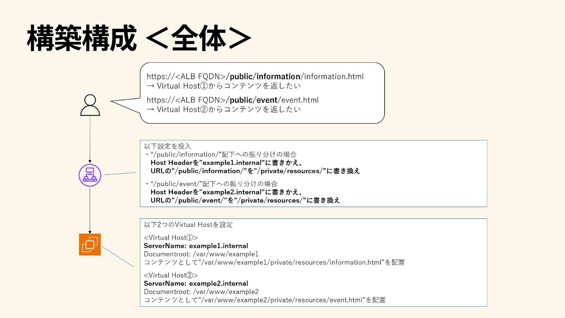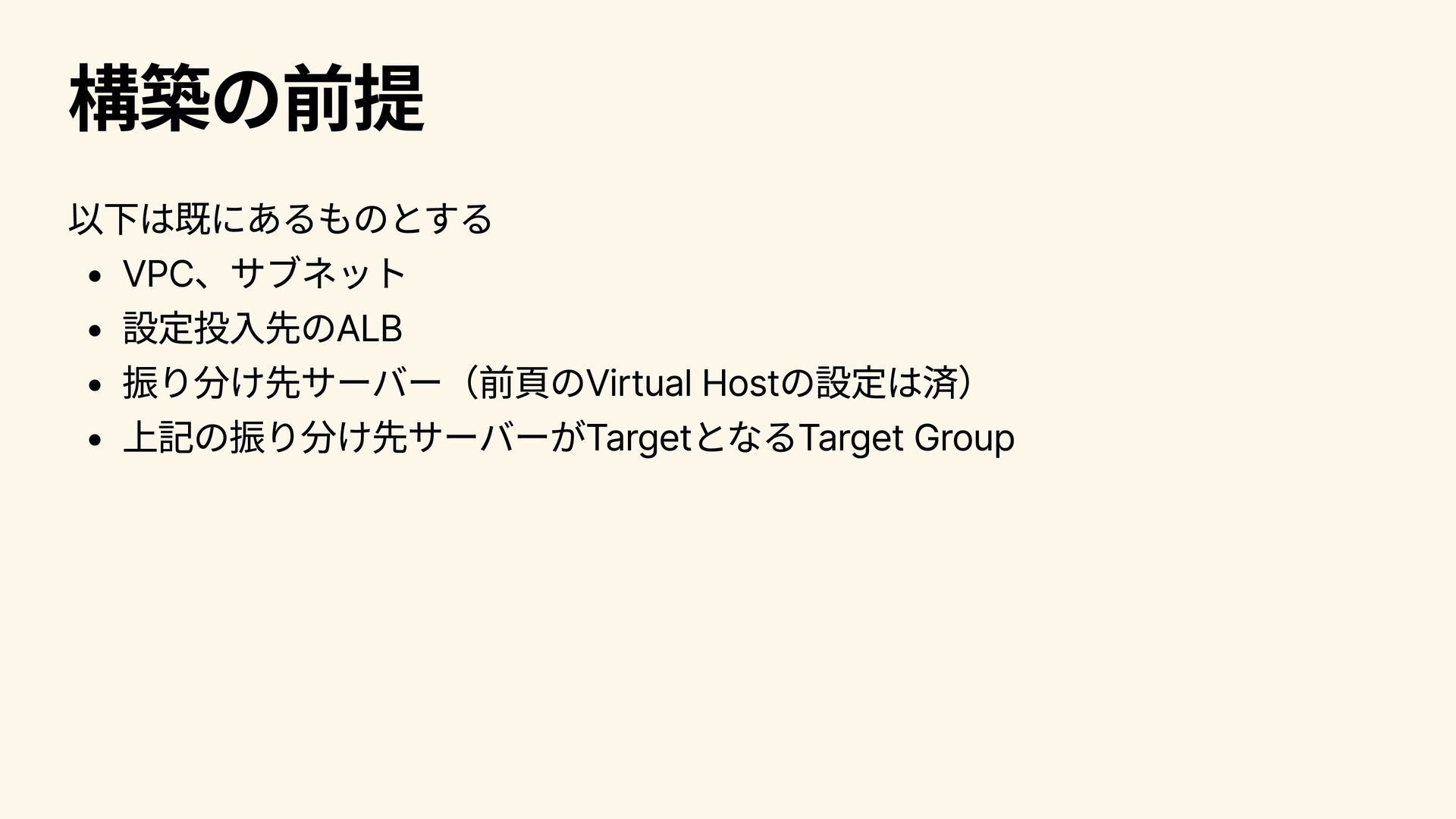 構築の前提 以下は既にあるものとする VPC、サブネット 設定投入先のALB 振り分け先サーバー(前頁のVirtual Hostの設定は済) 上記の振り分け先サーバーがTargetとなるTarget Group