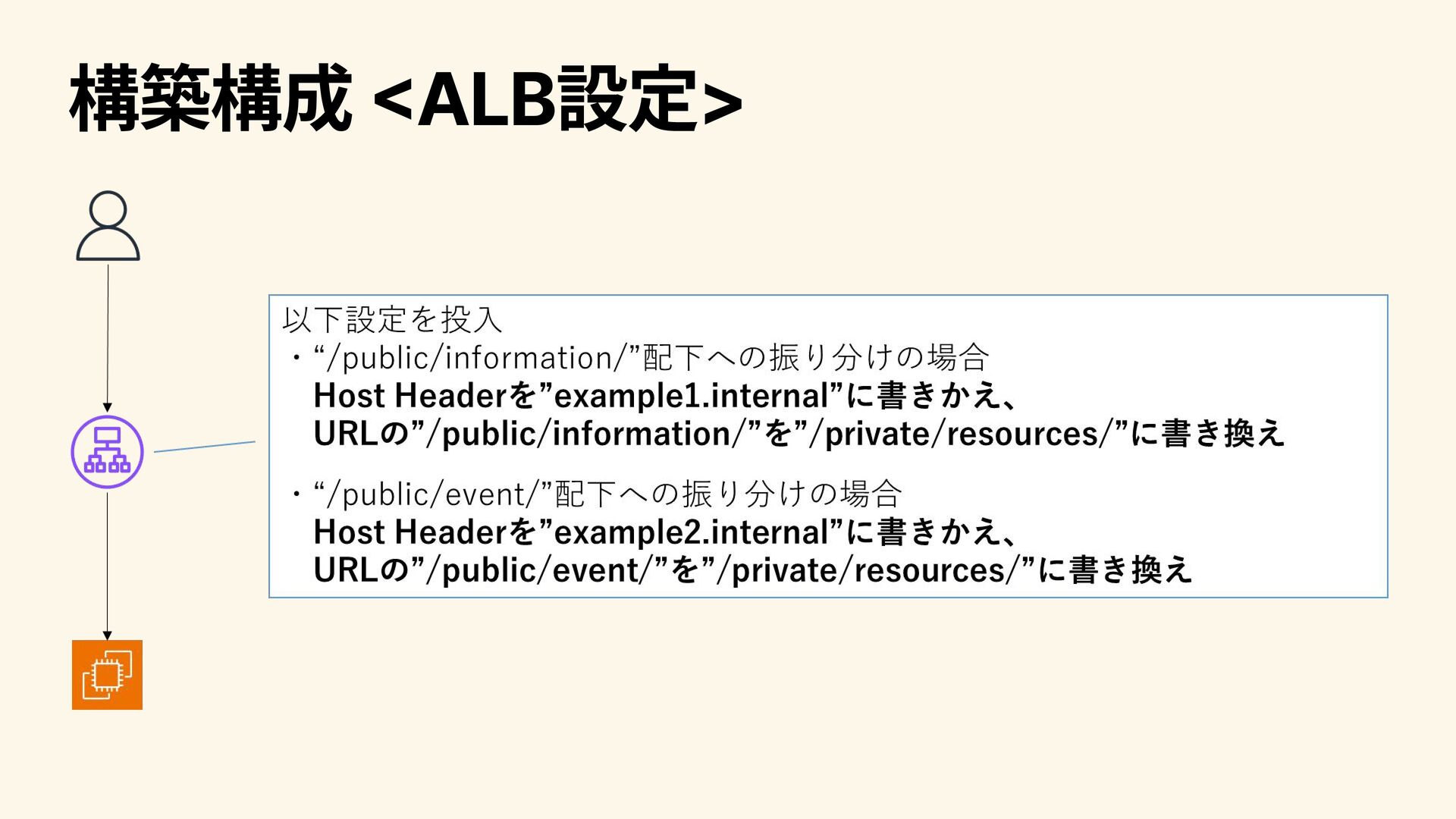 rewriteは以下のようなケースで利用される 振り分け先のサーバーは1種類だが、中で複数のVuritual Hostが構えている 何らかの事情で、ALBアクセス時とは異なるHost Headerで後段のサーバー、 サービス、等々にアクセスする必要がある etc..