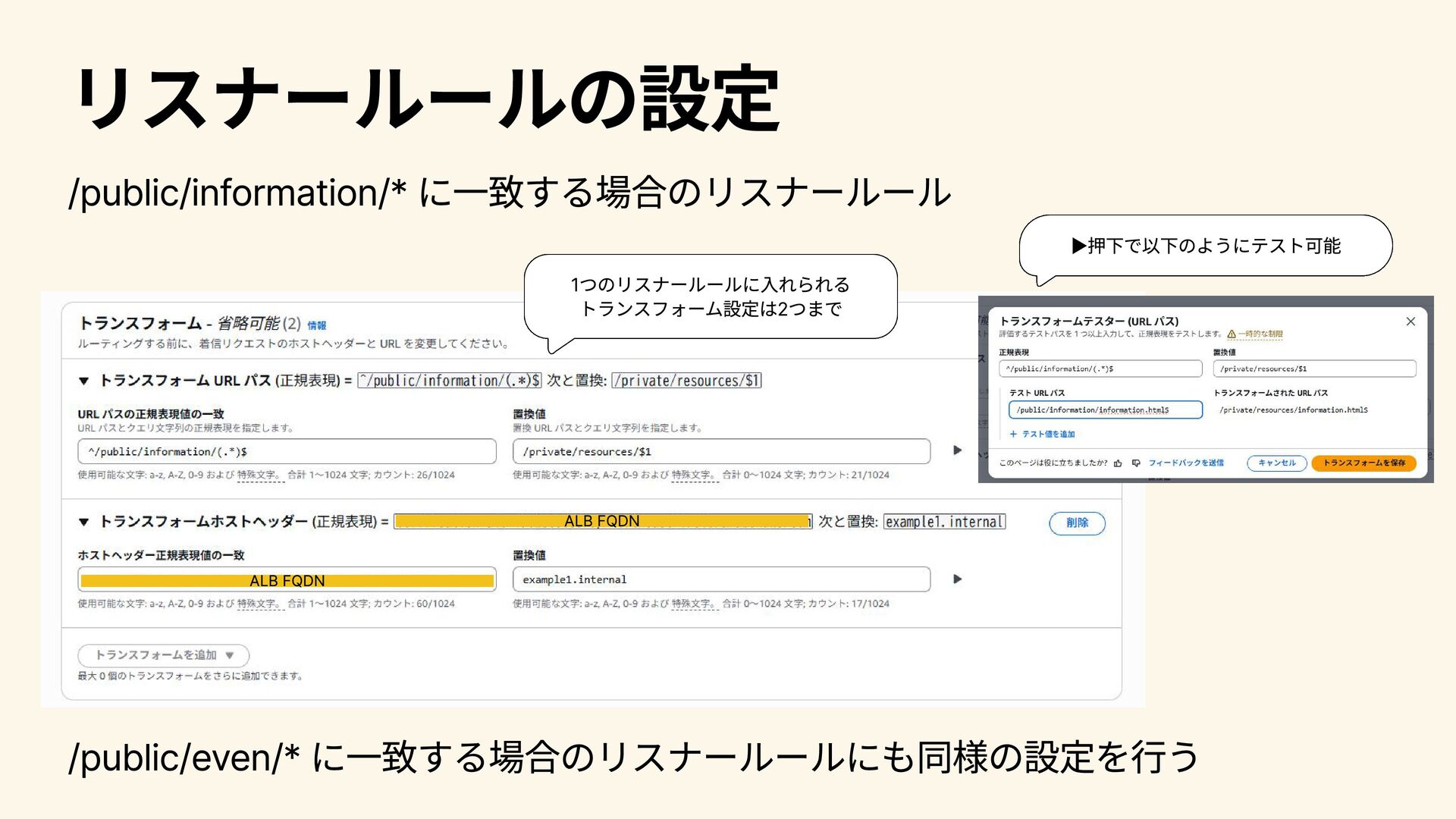リスナールールの設定 /public/information/* に一致する場合のリスナールール /public/even/* に一致する場合のリスナールールにも同様の設定を行う ▶押下で以下のようにテスト可能 1つのリスナールールに入れられる トランスフォーム設定は2つまで ALB FQDN