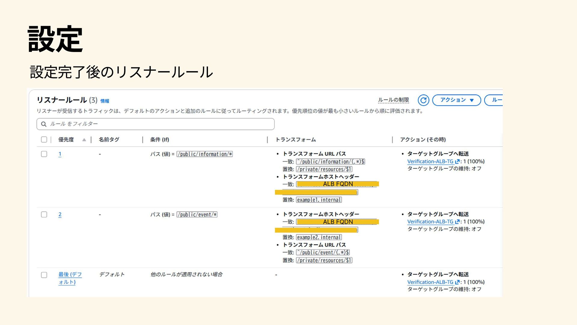 設定 設定完了後のリスナールール ALB FQDN ALB FQDN
