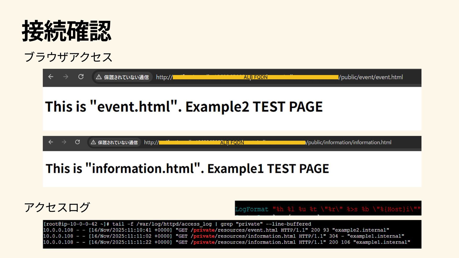 接続確認 ALB FQDN ALB FQDN ブラウザアクセス アクセスログ