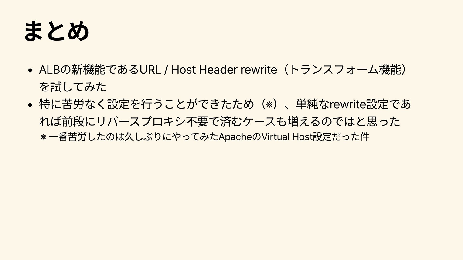 まとめ ALBの新機能であるURL / Host Header rewrite(トランスフォーム機能) を試してみた 特に苦労なく設定を行うことができたため(※)、単純なrewrite設定であ れば前段にリバースプロキシ不要で済むケースも増えるのではと思った