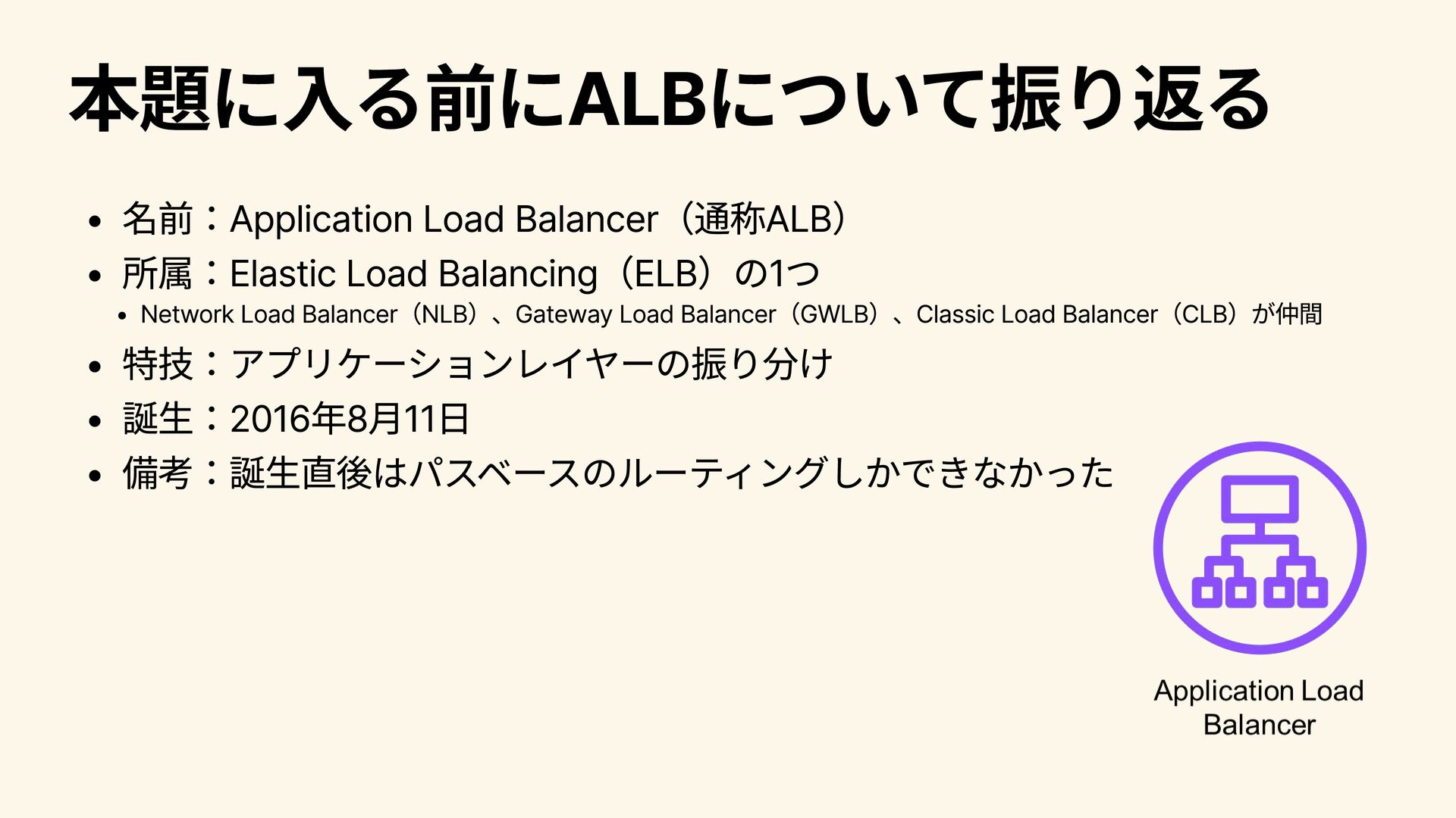 Load Balancer(GWLB)、Classic Load Balancer(CLB)が仲間 特技:アプリケーションレイヤーの振り分け 誕生:2016年8月11日 備考:誕生直後はパスベースのルーティングしかできなかった