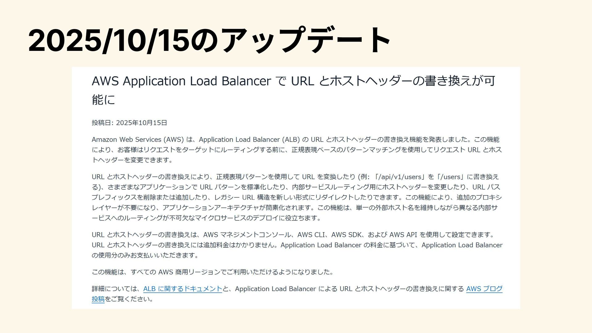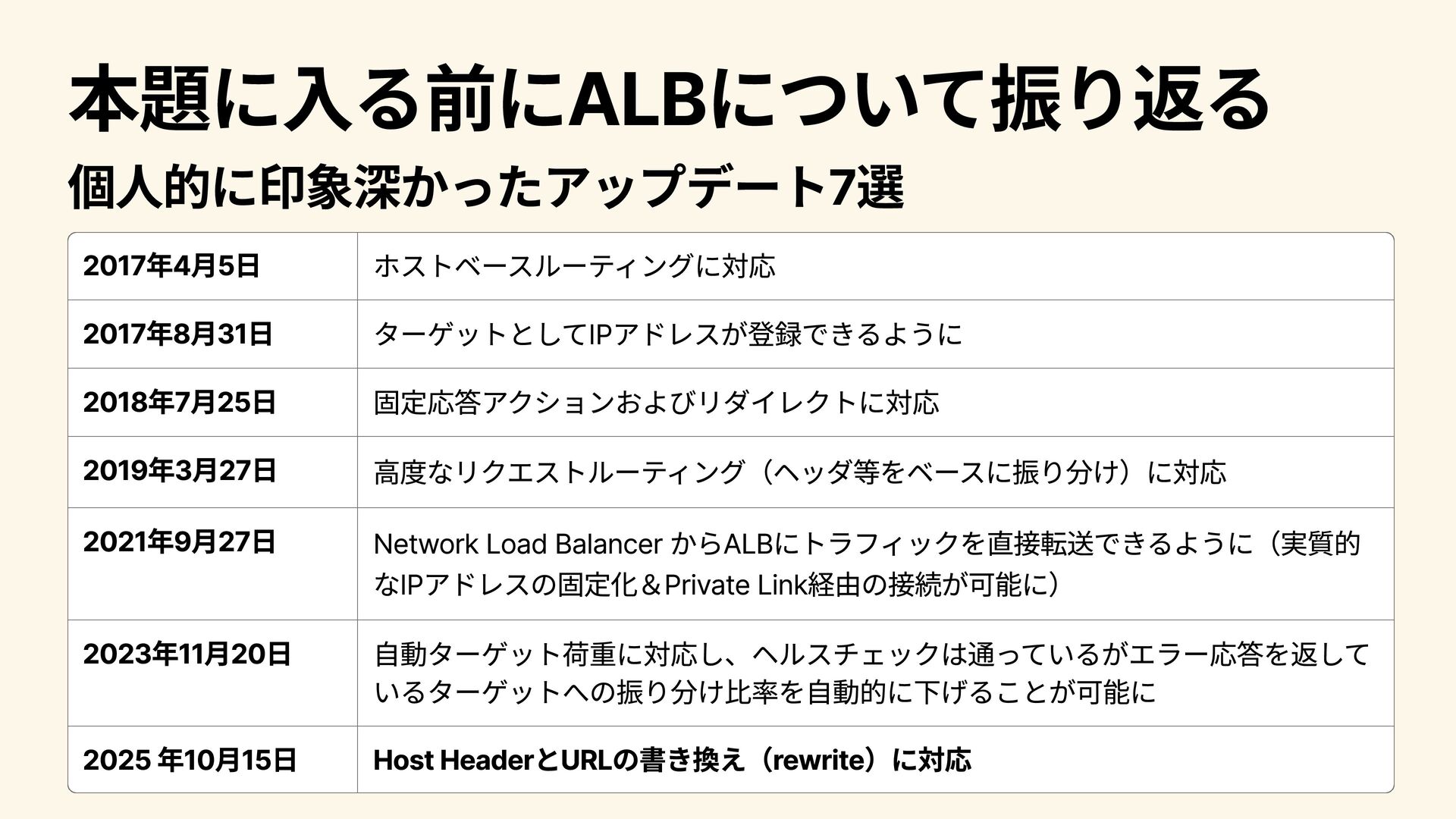 2021年9月27日 Network Load Balancer からALBにトラフィックを直接転送できるように(実質的 なIPアドレスの固定化&Private Link経由の接続が可能に) 2023年11月20日 自動ターゲット荷重に対応し、ヘルスチェックは通っているがエラー応答を返して いるターゲットへの振り分け比率を自動的に下げることが可能に 2025 年10月15日 Host HeaderとURLの書き換え(rewrite)に対応