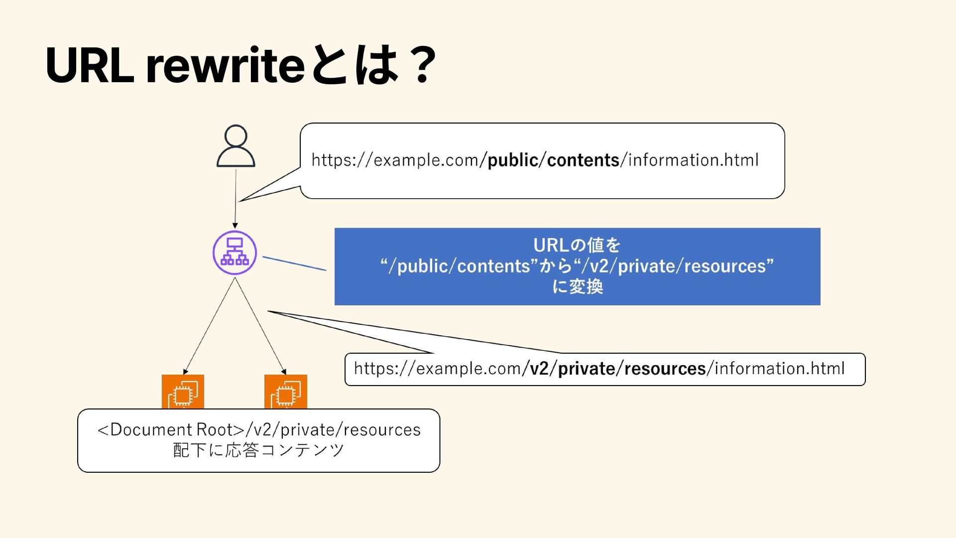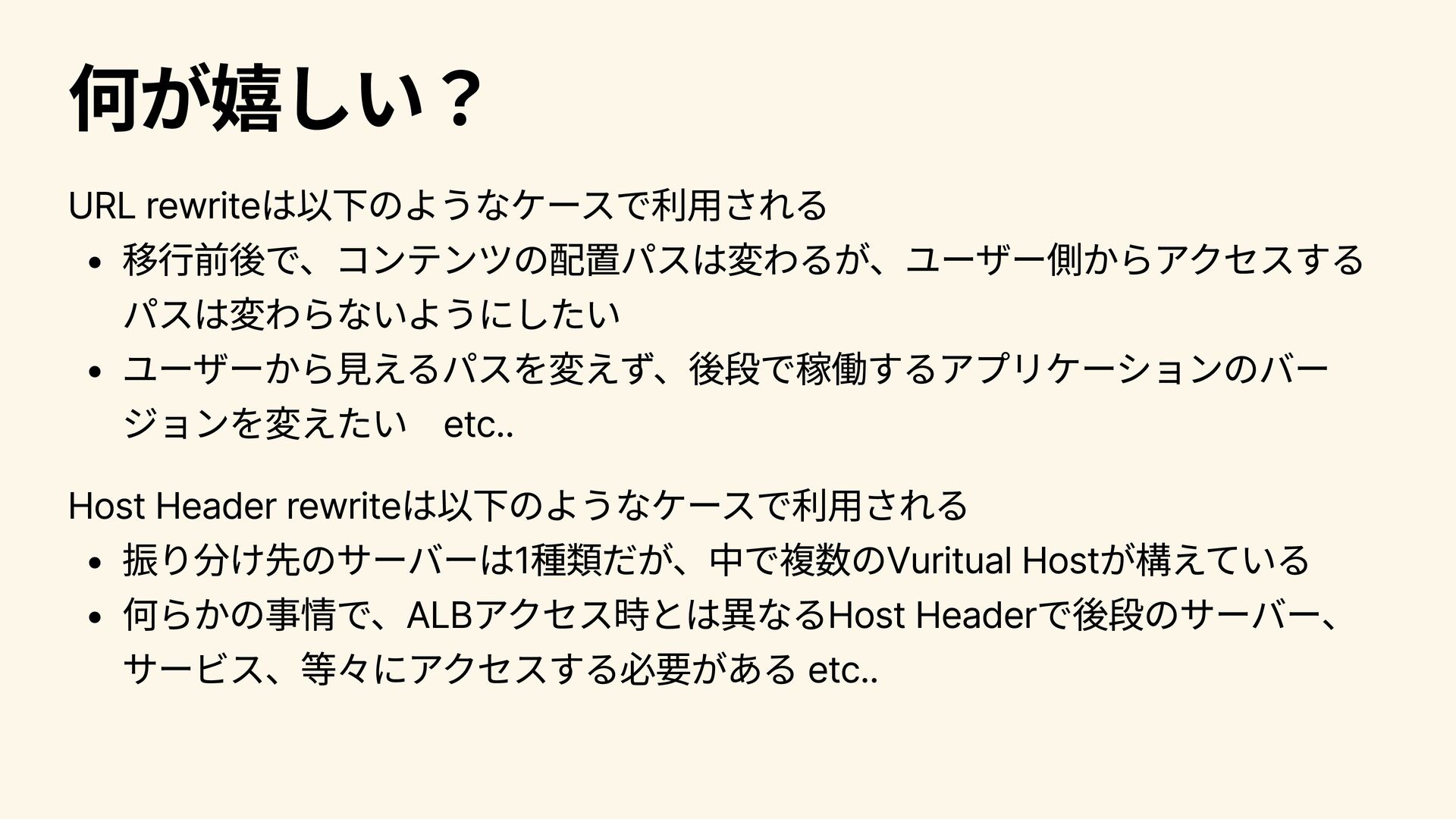 何が嬉しい? URL rewriteは以下のようなケースで利用される 移行前後で、コンテンツの配置パスは変わるが、ユーザー側からアクセスする パスは変わらないようにしたい ユーザーから見えるパスを変えず、後段で稼働するアプリケーションのバー ジョンを変えたい etc.. Host Header