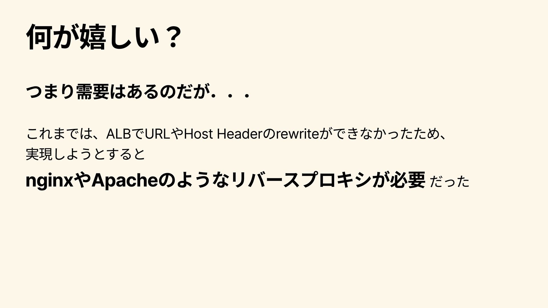 何が嬉しい? つまり需要はあるのだが... これまでは、ALBでURLやHost Headerのrewriteができなかったため、 実現しようとすると nginxやApacheのようなリバースプロキシが必要 だった