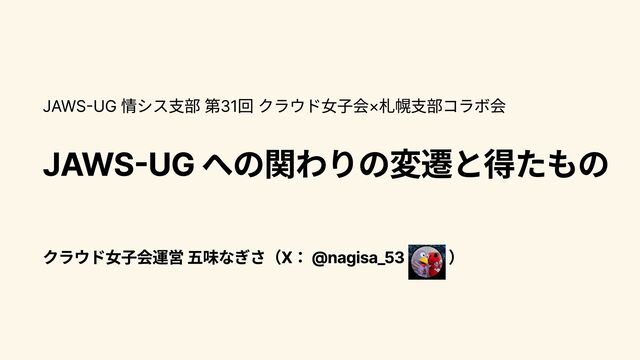 JAWS-UG 情シス支部 第31回 クラウド女子会×札幌支部コラボ会 JAWS-UG への関わりの変遷と得たもの クラウド女子会運営 五味なぎさ(X: @nagisa_53 )