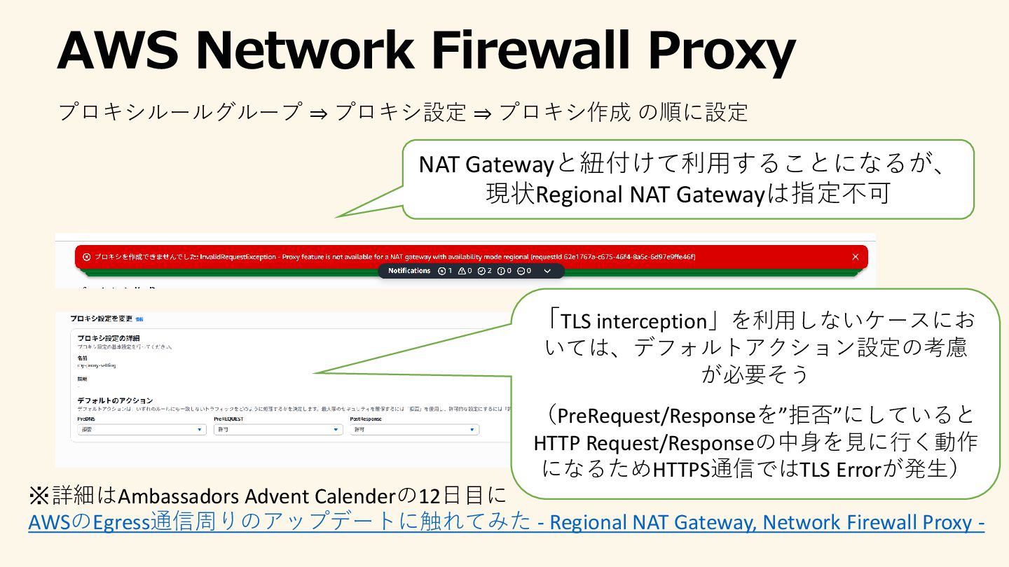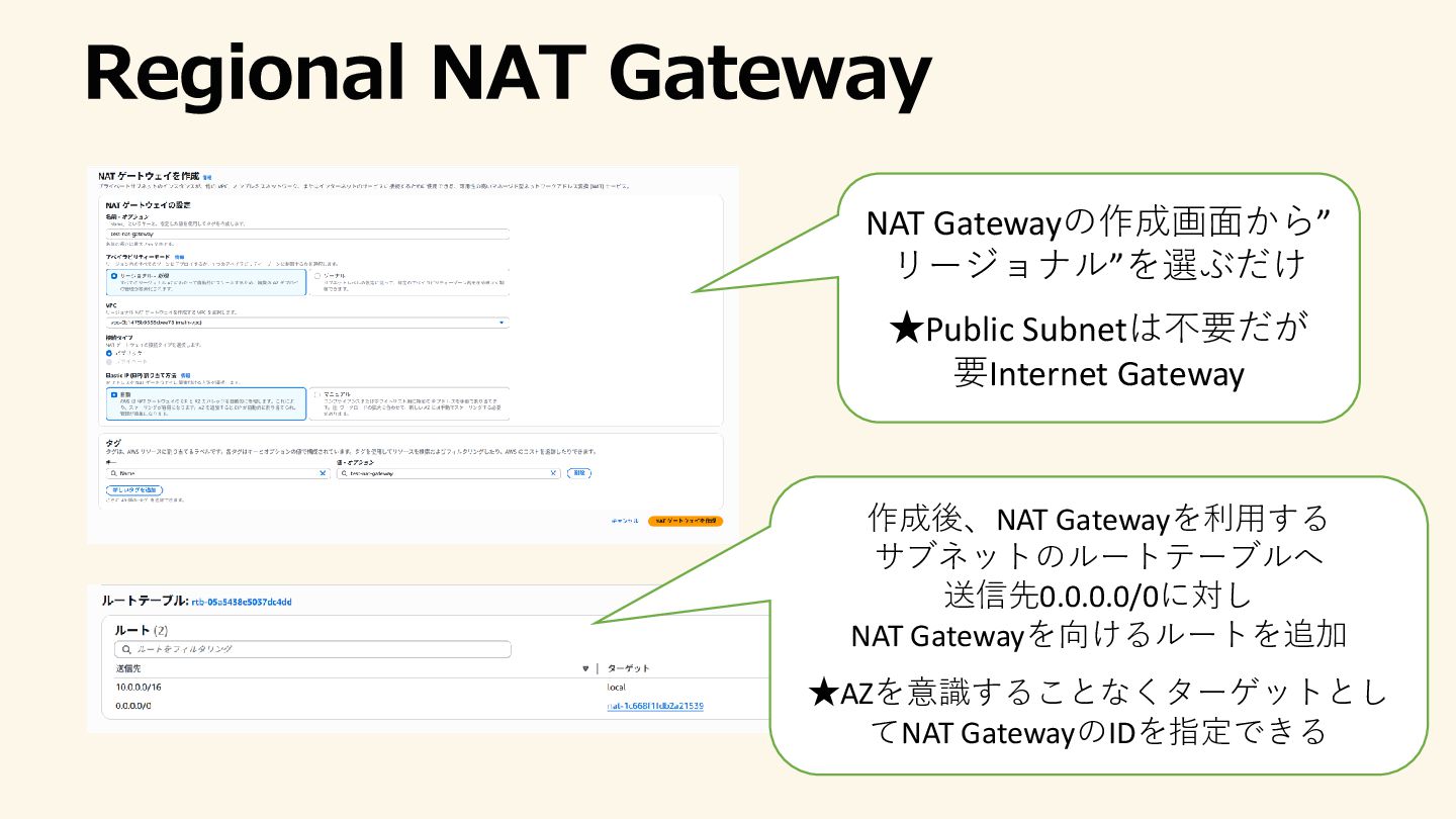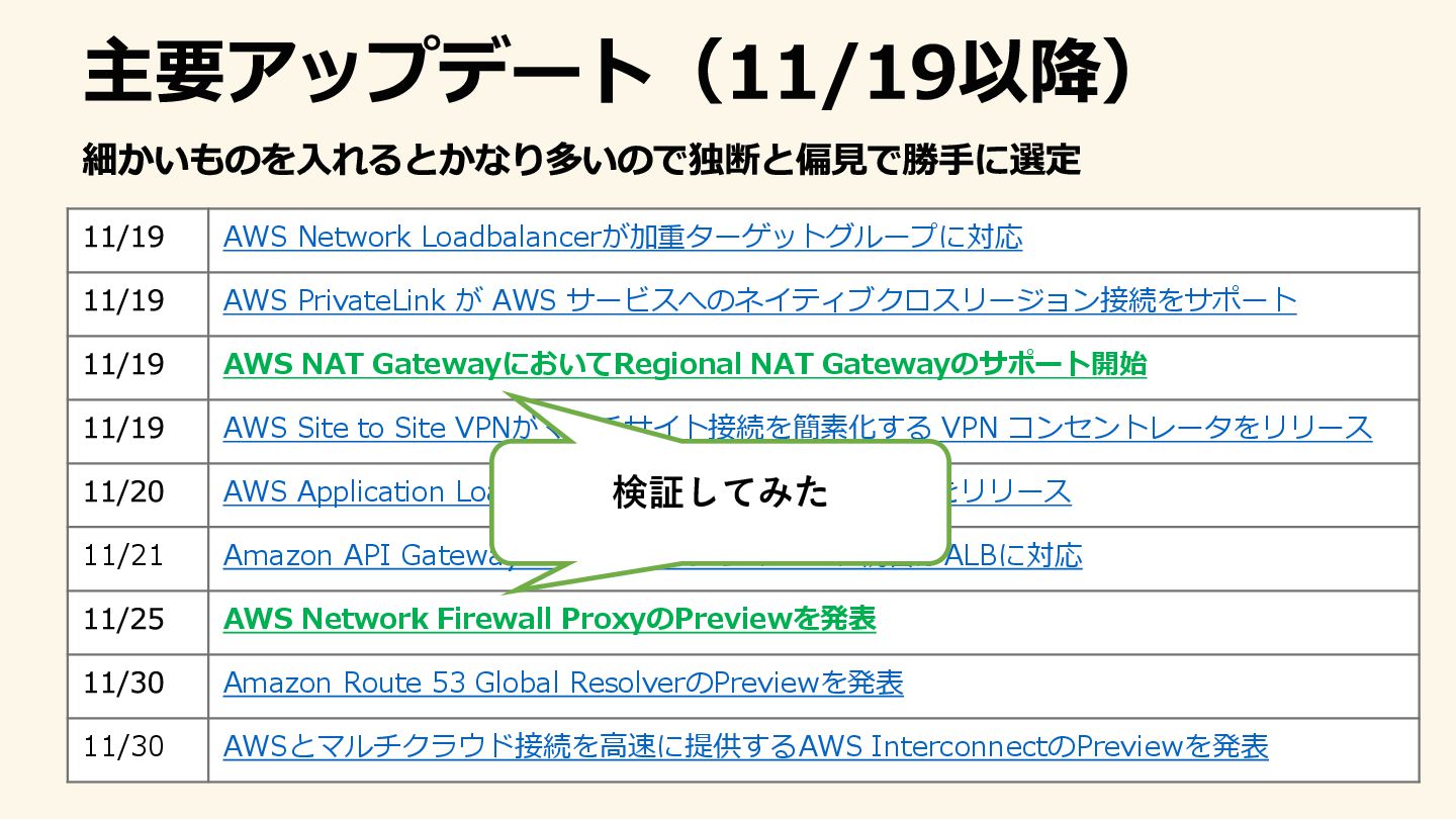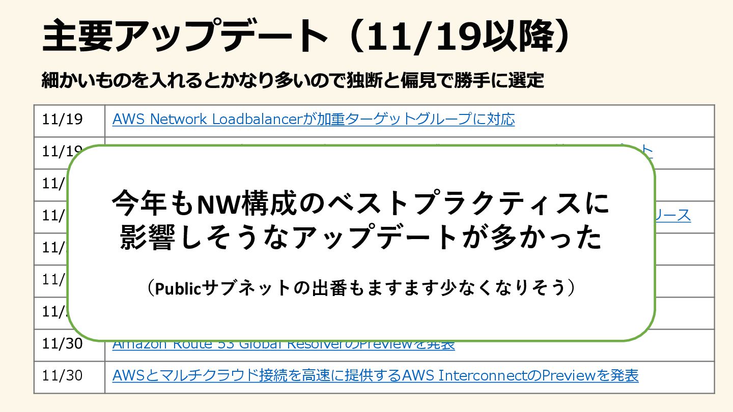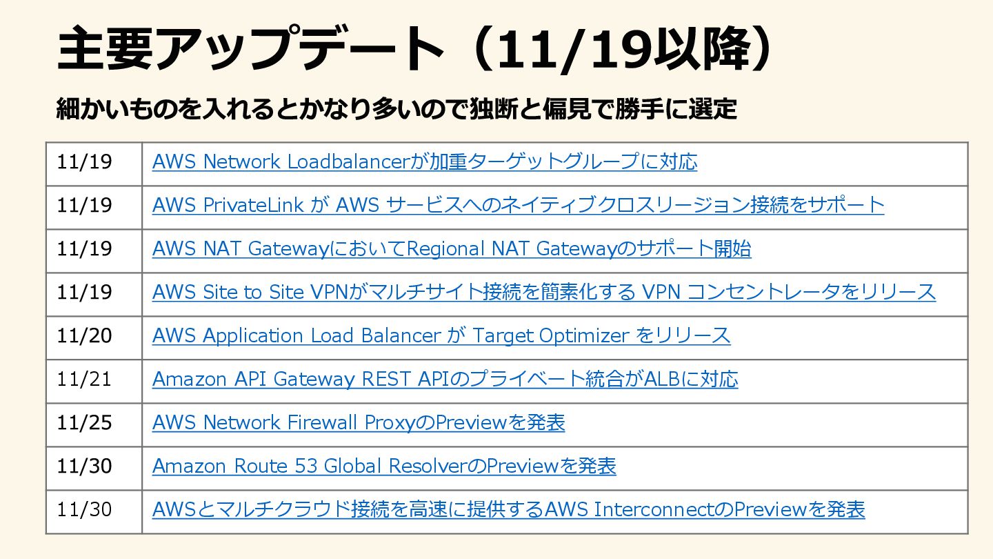 GatewayにおいてRegional NAT Gatewayのサポート開始 AWS Site to Site VPNがマルチサイト接続を簡素化する VPN コンセントレータをリリース AWS Application Load Balancer が Target Optimizer をリリース 11/21 Amazon API Gateway REST APIのプライベート統合がALBに対応 AWS Network Firewall ProxyのPreviewを発表 Amazon Route 53 Global ResolverのPreviewを発表 11/30 AWSとマルチクラウド接続を高速に提供するAWS InterconnectのPreviewを発表 今年もNW構成のベストプラクティスに 影響しそうなアップデートが多かった (Publicサブネットの出番もますます少なくなりそう)