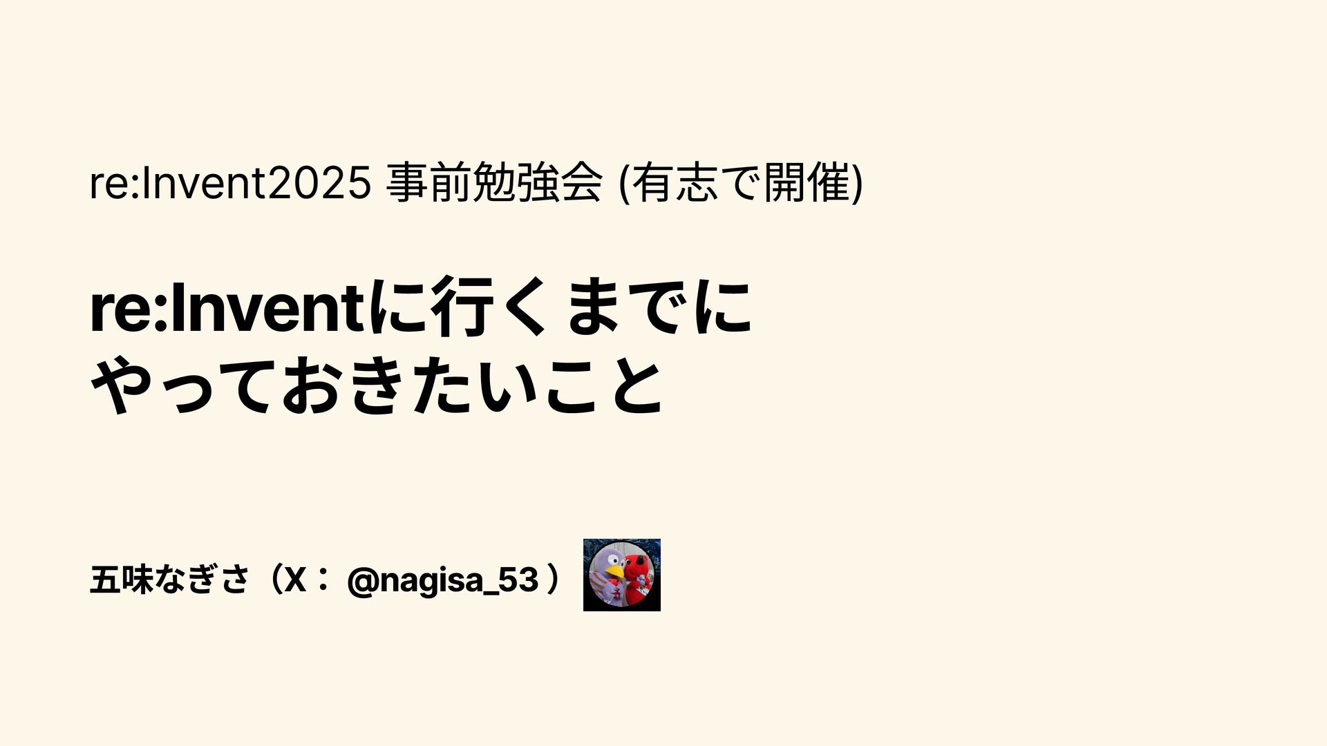 re:Invent2025 事前勉強会 (有志で開催) re:Inventに行くまでに やっておきたいこと 五味なぎさ(X: @nagisa_53 )
