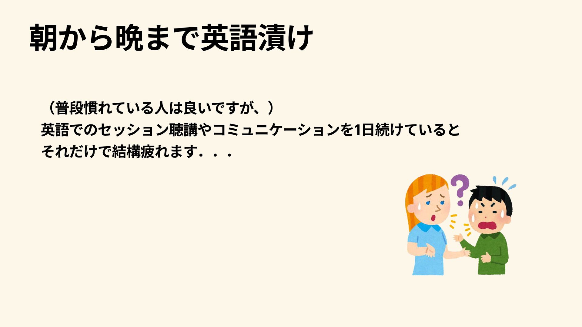 朝から晩まで英語漬け (普段慣れている人は良いですが、) 英語でのセッション聴講やコミュニケーションを1日続けていると それだけで結構疲れます...