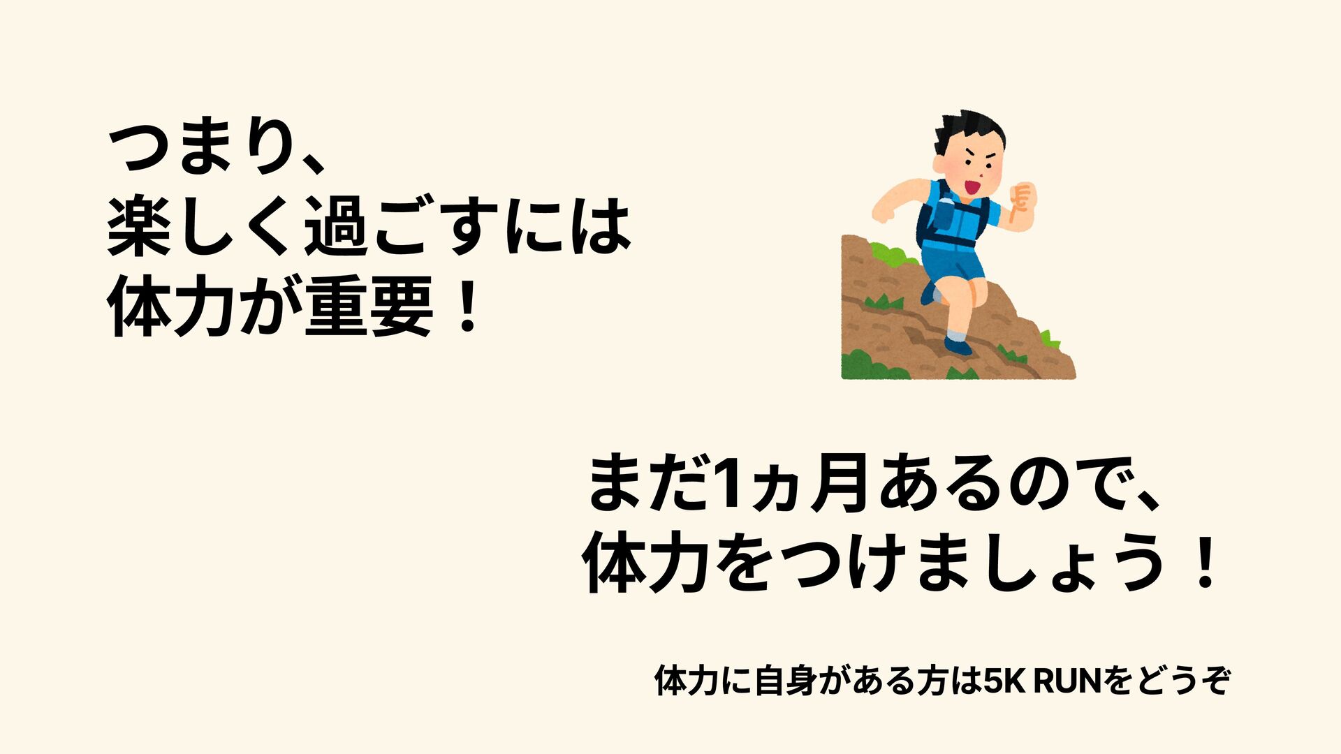 つまり、 楽しく過ごすには 体力が重要! まだ1ヵ月あるので、 体力をつけましょう! 体力に自身がある方は5K RUNをどうぞ