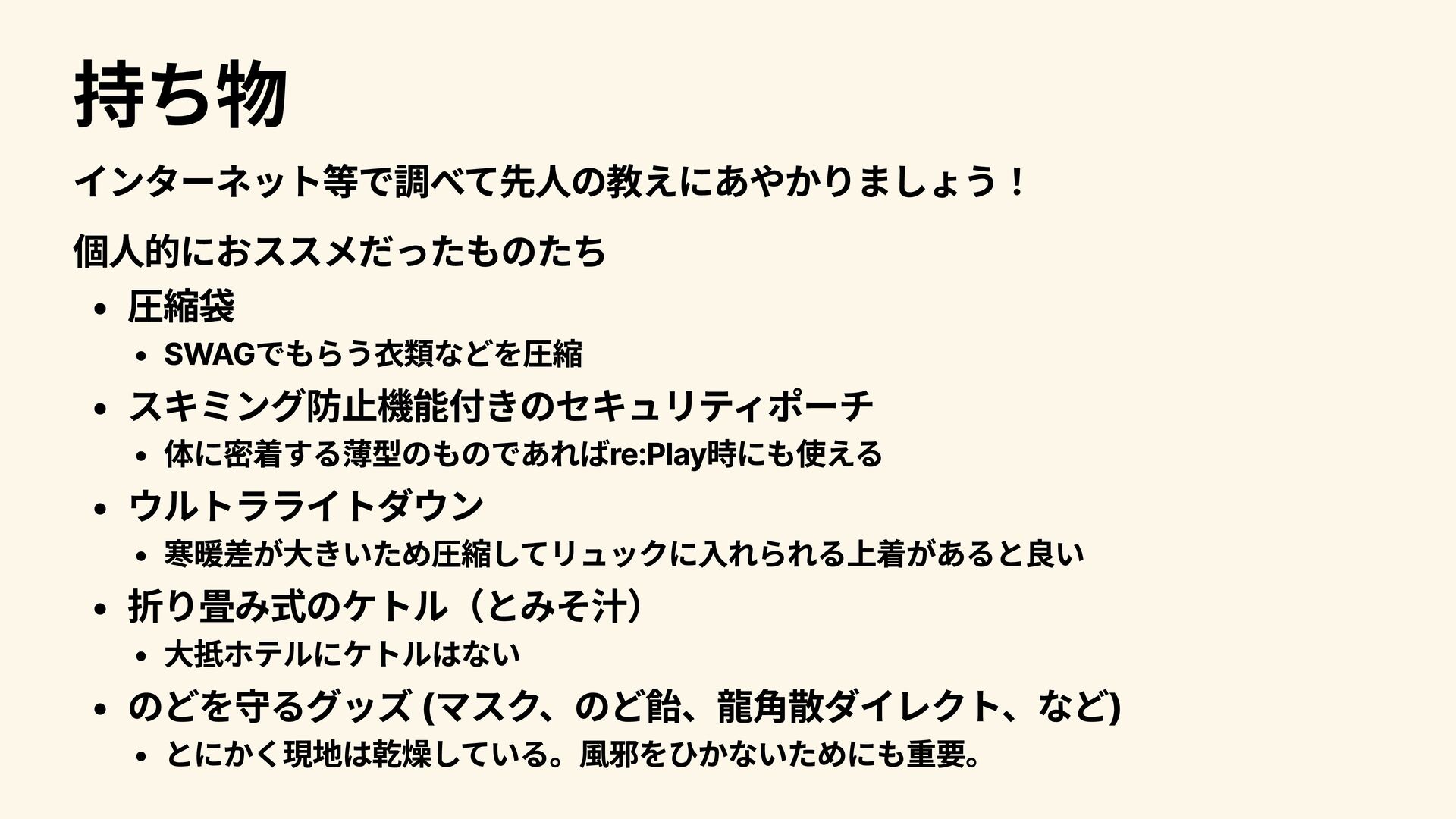 持ち物 インターネット等で調べて先人の教えにあやかりましょう! 個人的におススメだったものたち 圧縮袋 SWAGでもらう衣類などを圧縮 スキミング防止機能付きのセキュリティポーチ 体に密着する薄型のものであればre:Play時にも使える ウルトラライトダウン 寒暖差が大きいため圧縮してリュックに入れられる上着があると良い 折り畳み式のケトル(とみそ汁)