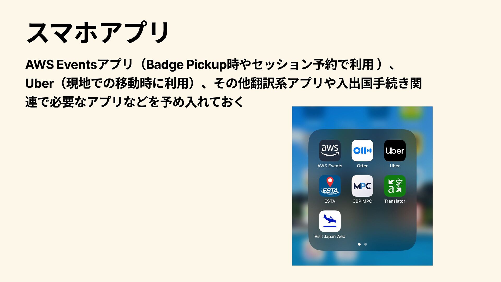 スマホアプリ AWS Eventsアプリ(Badge Pickup時やセッション予約で利用 )、 Uber(現地での移動時に利用)、その他翻訳系アプリや入出国手続き関 連で必要なアプリなどを予め入れておく