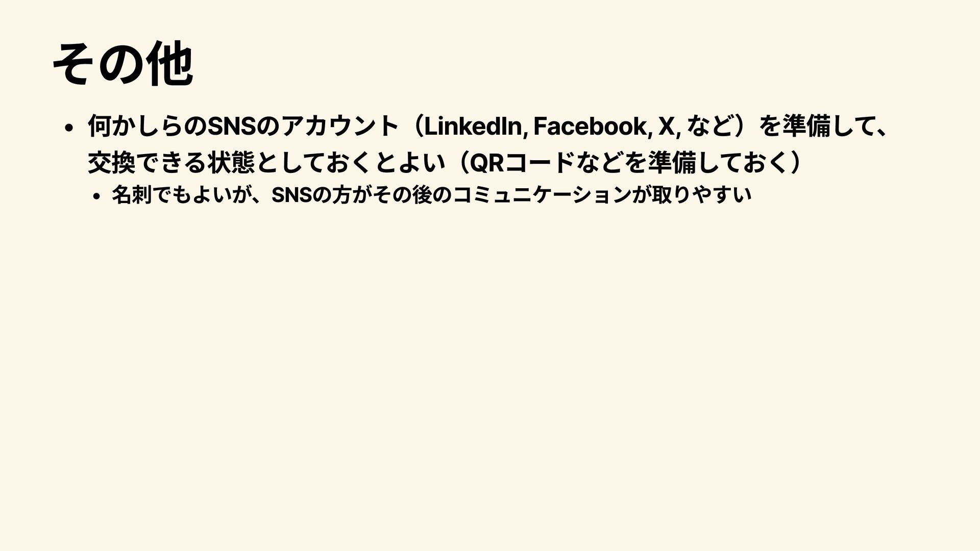 その他 何かしらのSNSのアカウント(LinkedIn, Facebook, X, など)を準備して、 交換できる状態としておくとよい(QRコードなどを準備しておく) 名刺でもよいが、SNSの方がその後のコミュニケーションが取りやすい