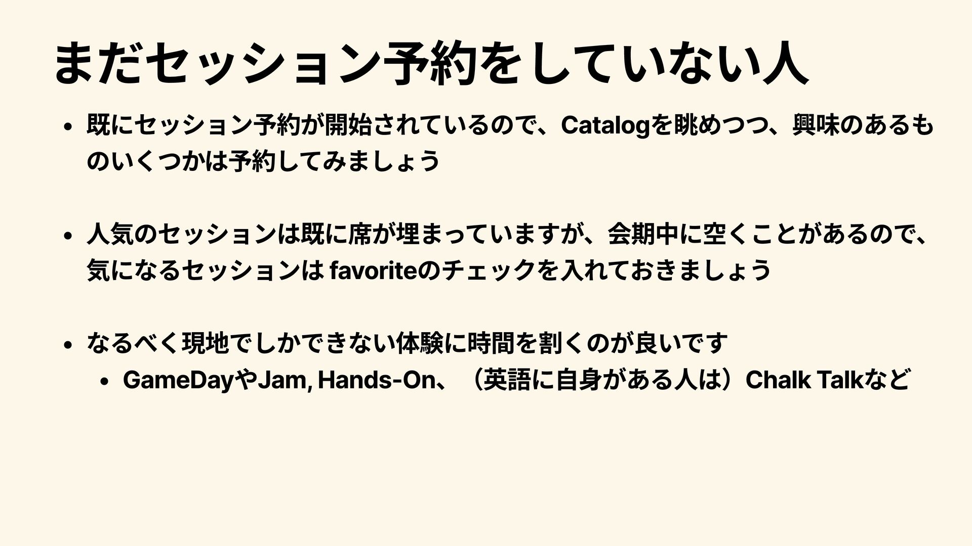 既にセッション予約が開始されているので、Catalogを眺めつつ、興味のあるも のいくつかは予約してみましょう 人気のセッションは既に席が埋まっていますが、会期中に空くことがあるので、 気になるセッションは favoriteのチェックを入れておきましょう なるべく現地でしかできない体験に時間を割くのが良いです GameDayやJam, Hands-On、(英語に自身がある人は)Chalk Talkなど まだセッション予約をしていない人