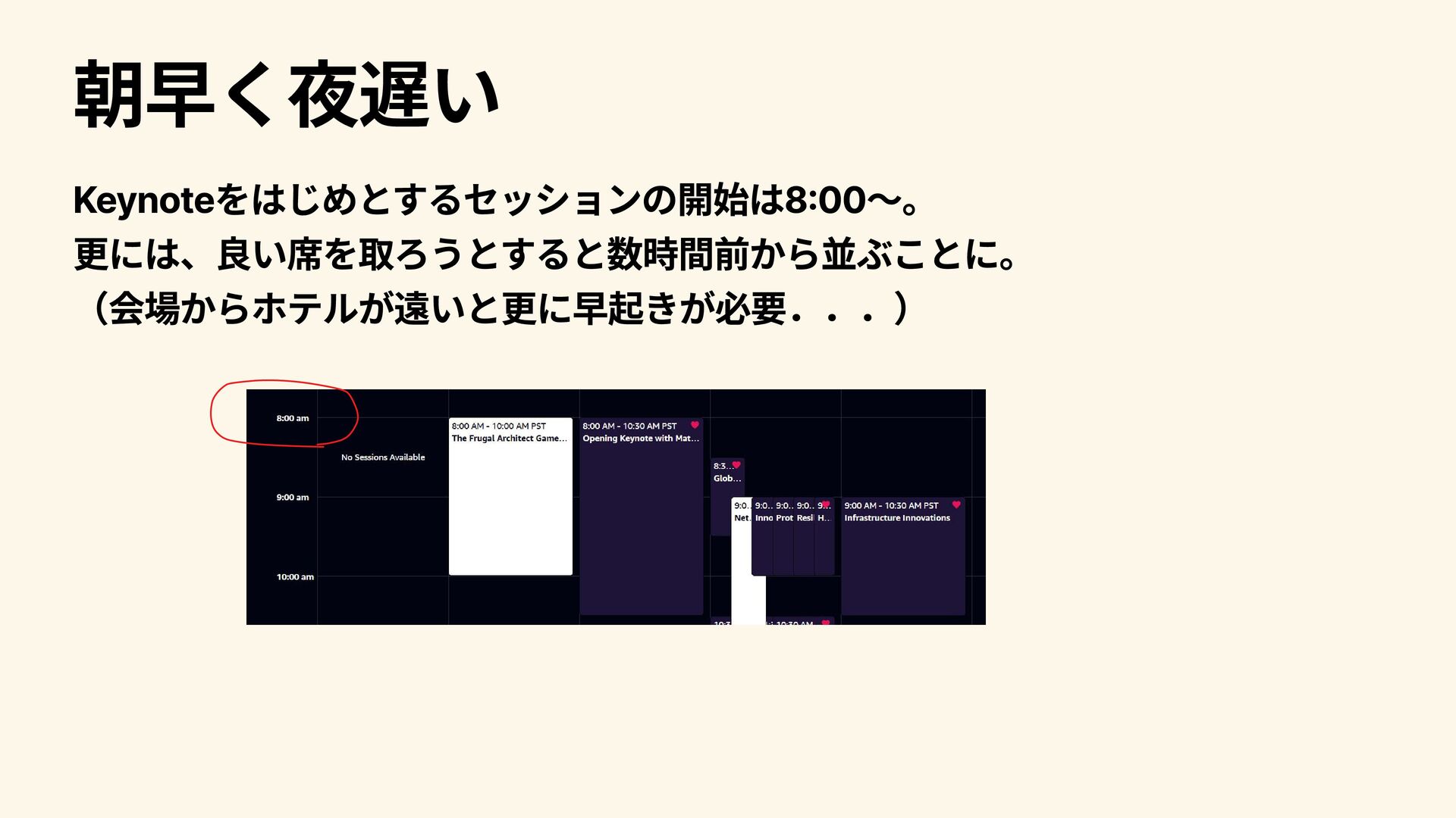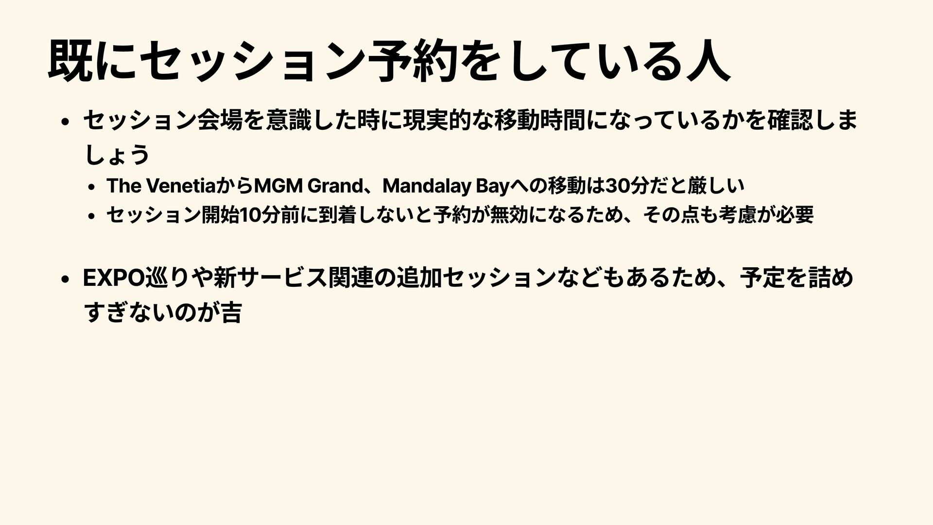 セッション会場を意識した時に現実的な移動時間になっているかを確認しま しょう The VenetiaからMGM Grand、Mandalay Bayへの移動は30分だと厳しい セッション開始10分前に到着しないと予約が無効になるため、その点も考慮が必要 EXPO巡りや新サービス関連の追加セッションなどもあるため、予定を詰め すぎないのが吉 既にセッション予約をしている人