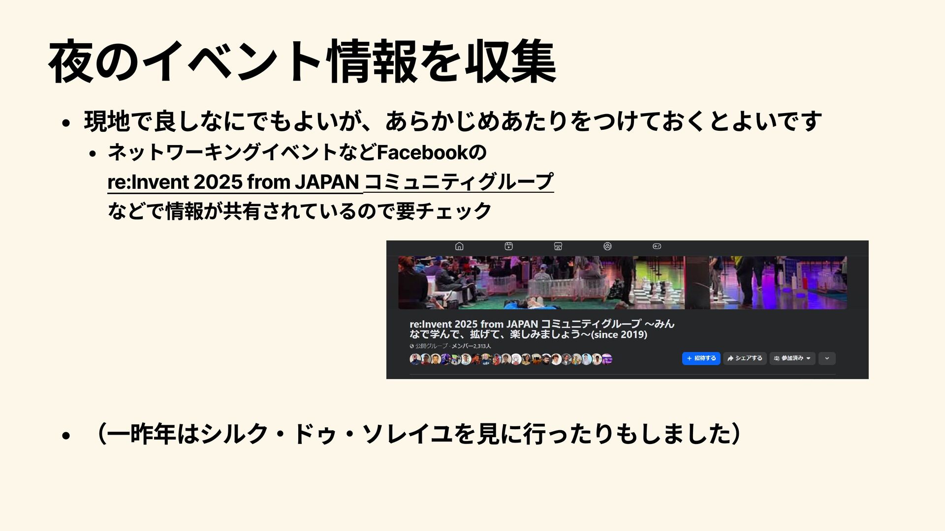 現地で良しなにでもよいが、あらかじめあたりをつけておくとよいです ネットワーキングイベントなどFacebookの re:Invent 2025 from JAPAN コミュニティグループ などで情報が共有されているので要チェック (一昨年はシルク・ドゥ・ソレイユを見に行ったりもしました) 夜のイベント情報を収集