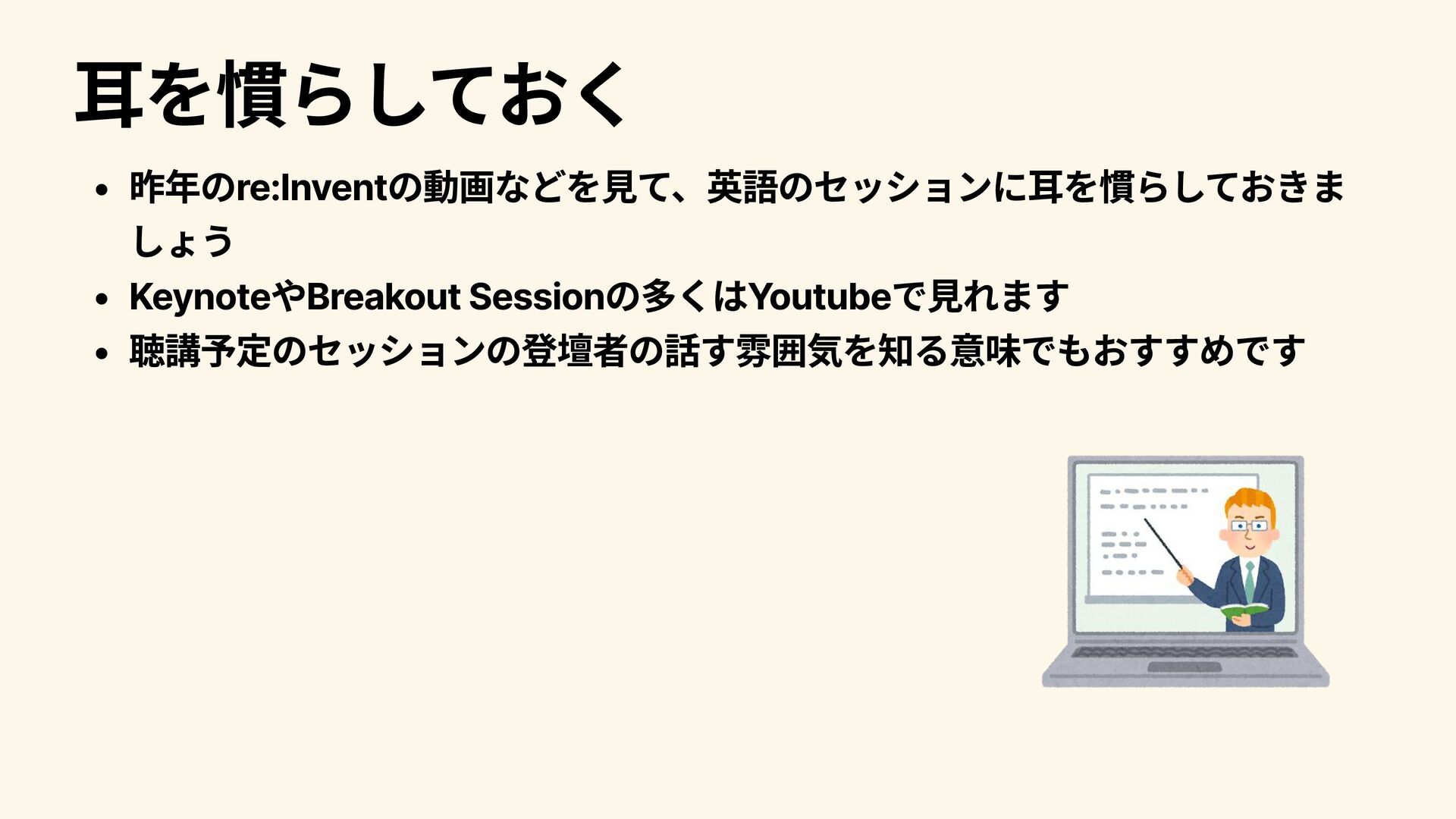昨年のre:Inventの動画などを見て、英語のセッションに耳を慣らしておきま しょう KeynoteやBreakout Sessionの多くはYoutubeで見れます 聴講予定のセッションの登壇者の話す雰囲気を知る意味でもおすすめです 耳を慣らしておく