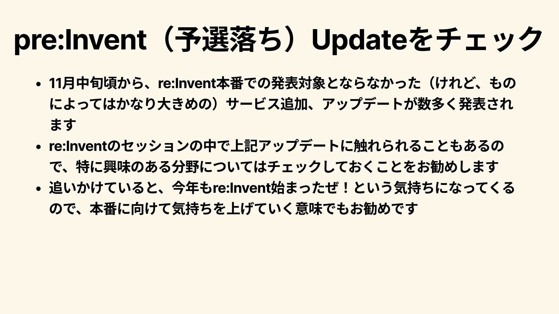 11月中旬頃から、re:Invent本番での発表対象とならなかった(けれど、もの によってはかなり大きめの)サービス追加、アップデートが数多く発表され ます re:Inventのセッションの中で上記アップデートに触れられることもあるの で、特に興味のある分野についてはチェックしておくことをお勧めします 追いかけていると、今年もre:Invent始まったぜ!という気持ちになってくる ので、本番に向けて気持ちを上げていく意味でもお勧めです pre:Invent(予選落ち)Updateをチェック