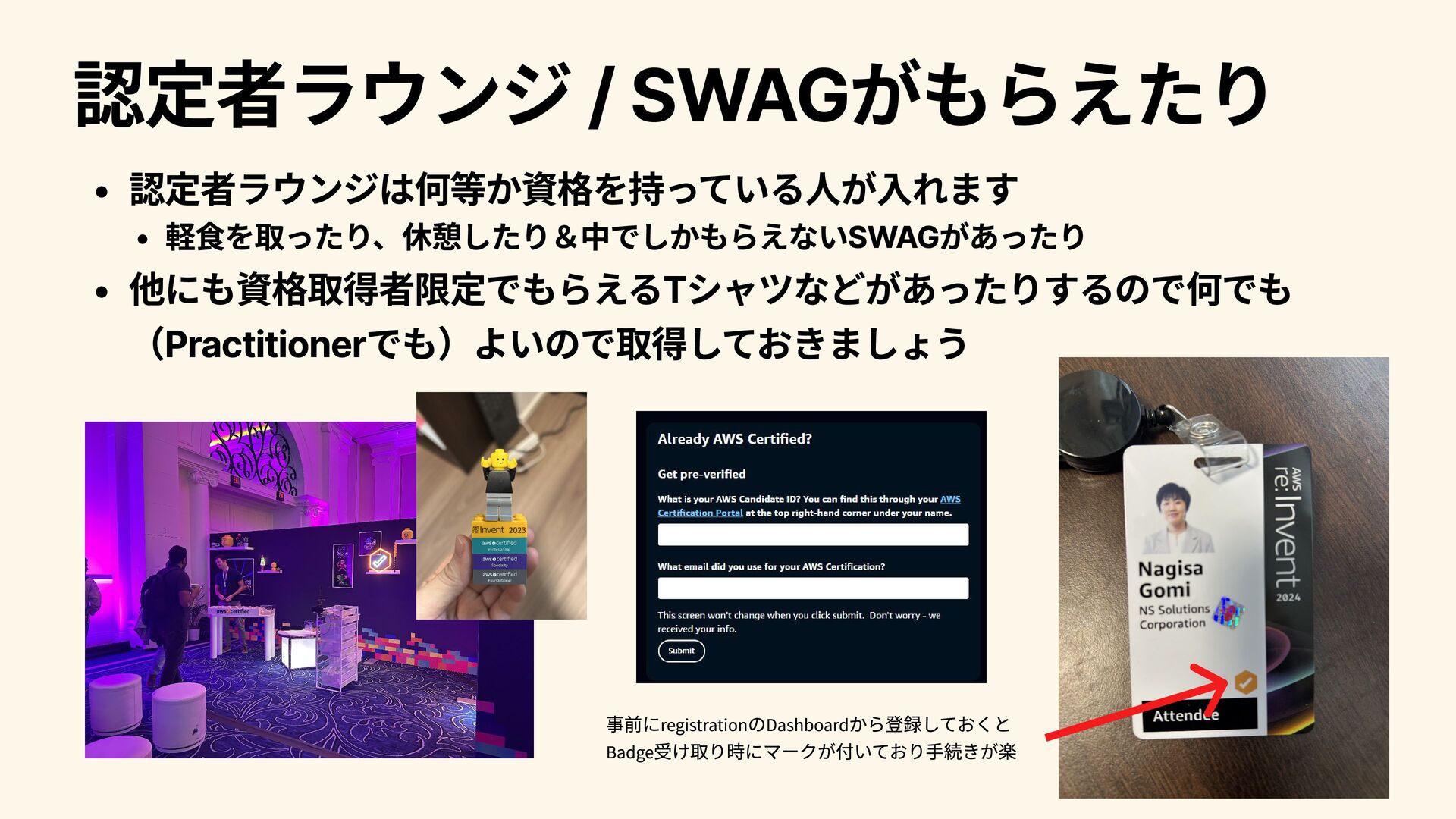 認定者ラウンジは何等か資格を持っている人が入れます 軽食を取ったり、休憩したり&中でしかもらえないSWAGがあったり 他にも資格取得者限定でもらえるTシャツなどがあったりするので何でも (Practitionerでも)よいので取得しておきましょう 認定者ラウンジ / SWAGがもらえたり 事前にregistrationのDashboardから登録しておくと Badge受け取り時にマークが付いており手続きが楽