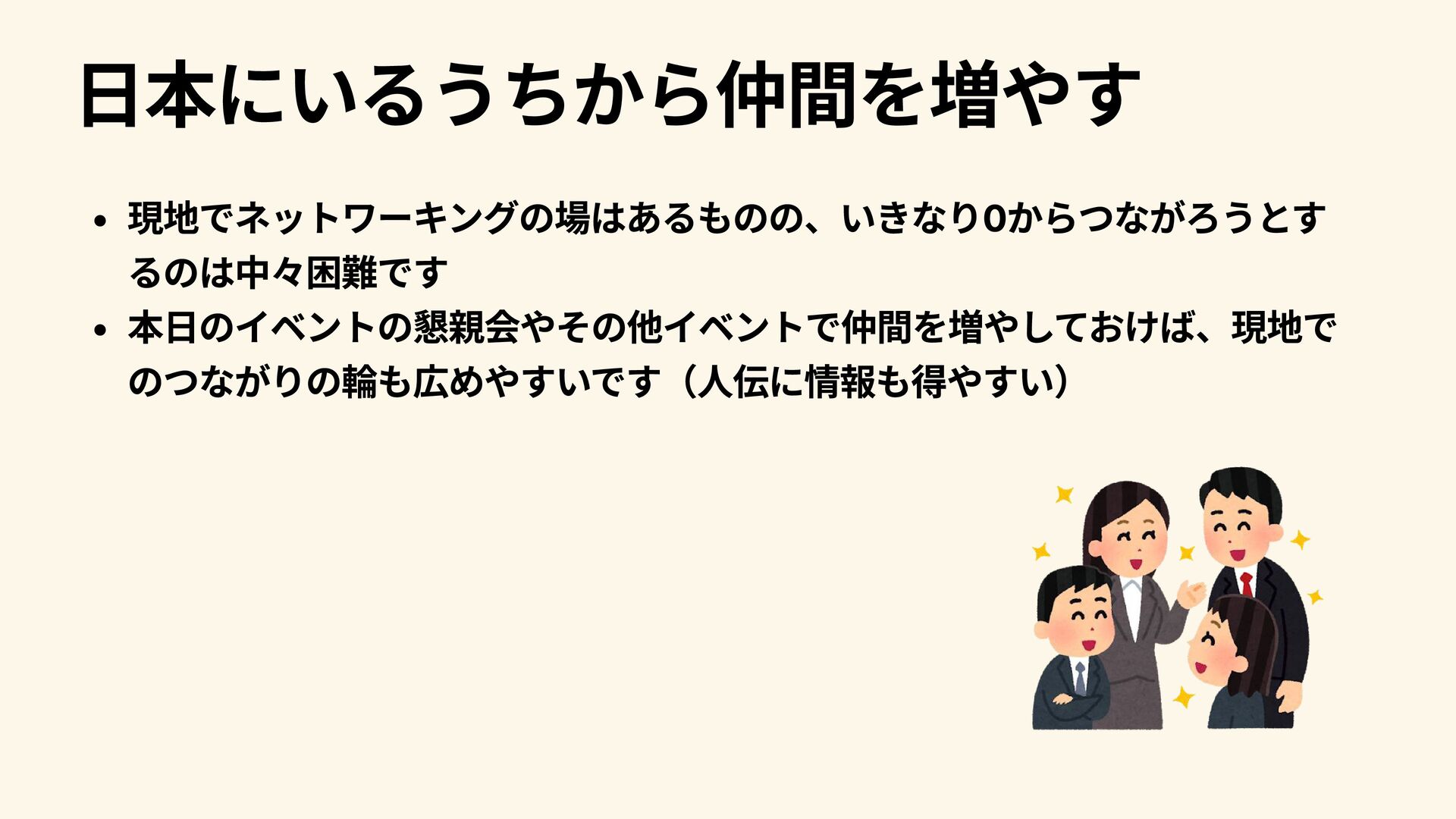 現地でネットワーキングの場はあるものの、いきなり0からつながろうとす るのは中々困難です 本日のイベントの懇親会やその他イベントで仲間を増やしておけば、現地で のつながりの輪も広めやすいです(人伝に情報も得やすい) 日本にいるうちから仲間を増やす