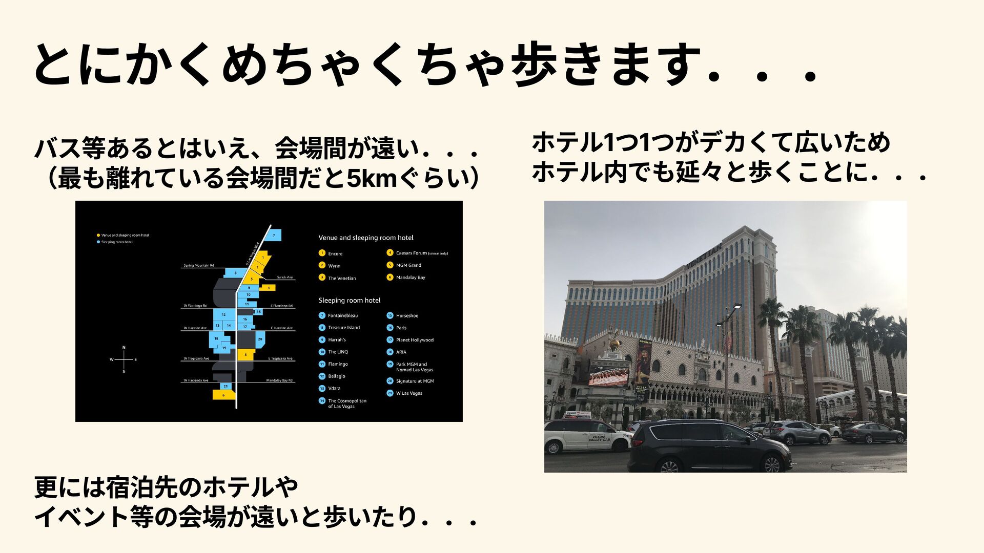 バス等あるとはいえ、会場間が遠い... (最も離れている会場間だと5kmぐらい) ホテル1つ1つがデカくて広いため ホテル内でも延々と歩くことに... 更には宿泊先のホテルや イベント等の会場が遠いと歩いたり... とにかくめちゃくちゃ歩きます...