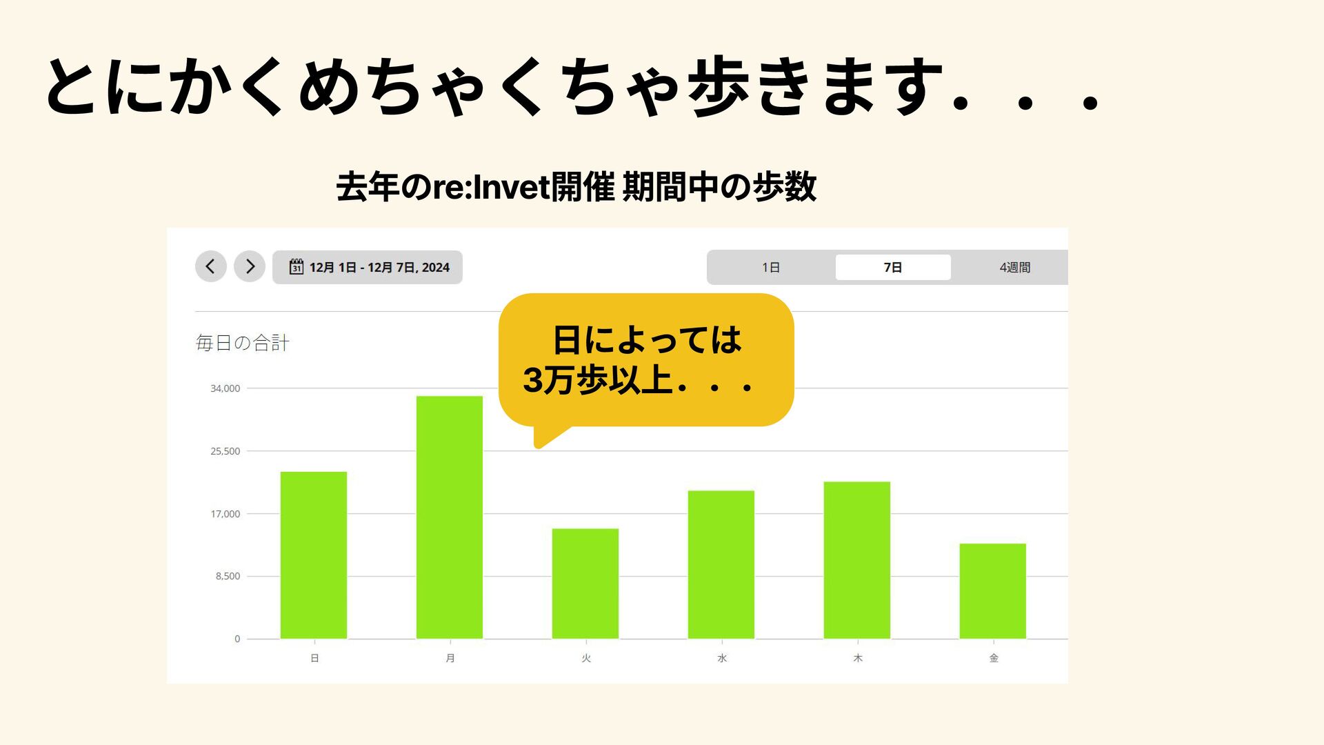 去年のre:Invet開催 期間中の歩数 とにかくめちゃくちゃ歩きます... 日によっては 3万歩以上...