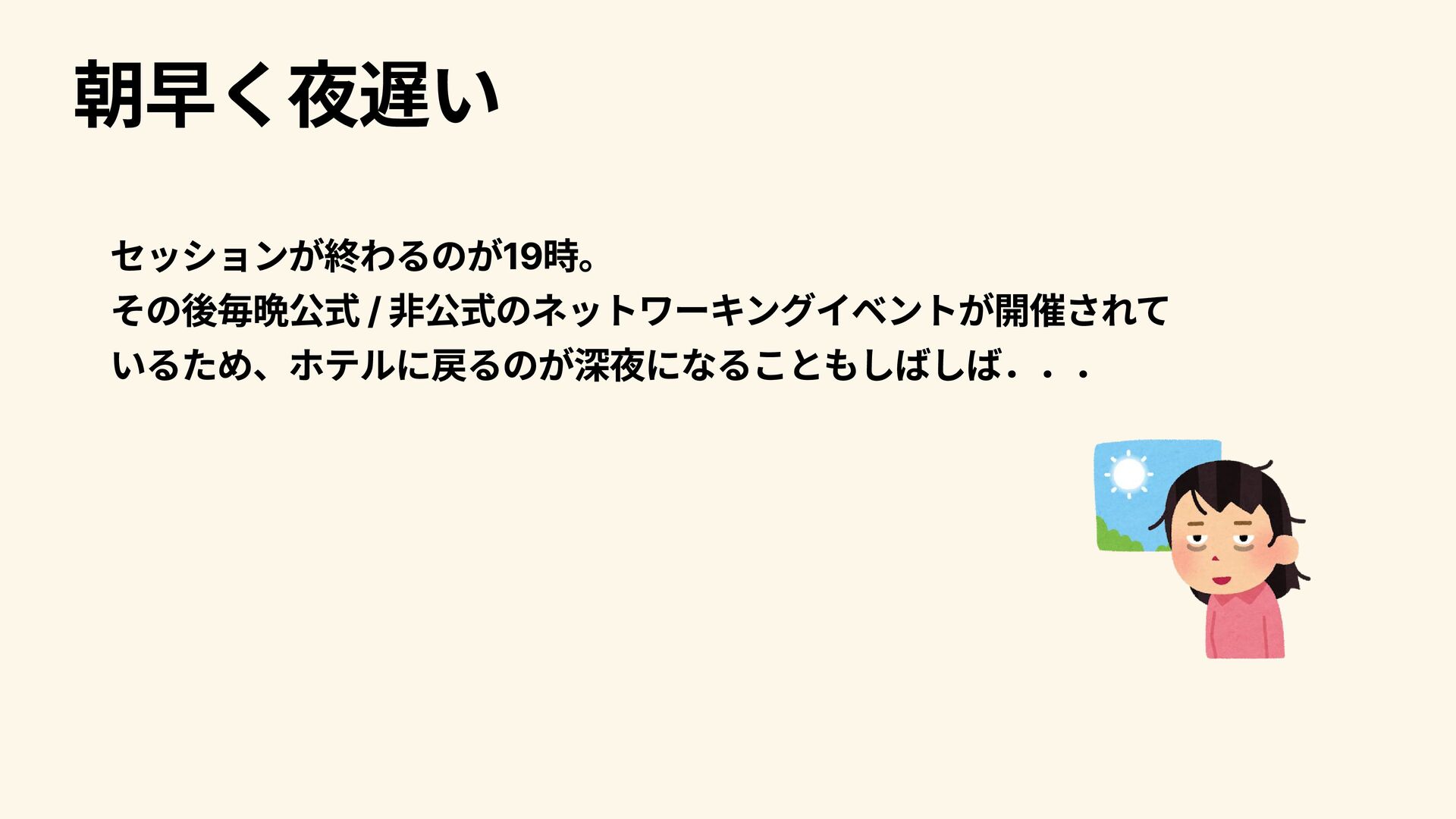 朝早く夜遅い セッションが終わるのが19時。 その後毎晩公式 / 非公式のネットワーキングイベントが開催されて いるため、ホテルに戻るのが深夜になることもしばしば...