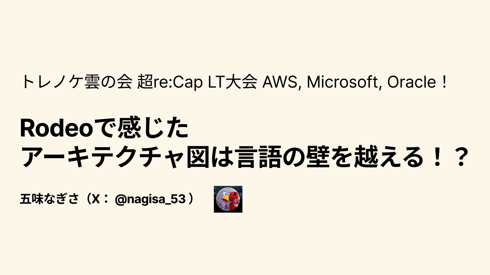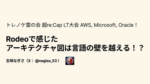 トレノケ雲の会 超re:Cap LT大会 AWS, Microsoft, Oracle! Rodeoで感じた アーキテクチャ図は言語の壁を越える!? 五味なぎさ(X: @nagisa_53
