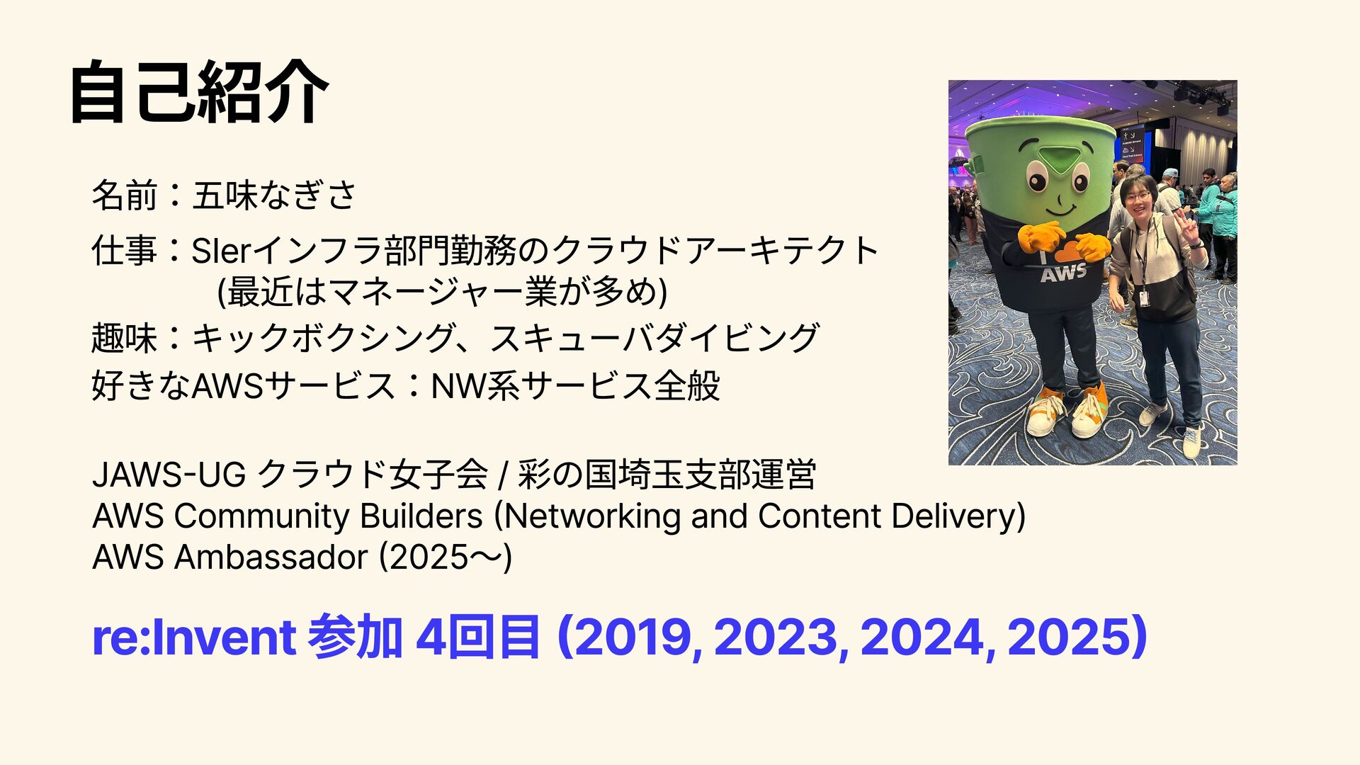 AWS Community Builders (Networking and Content Delivery) AWS Ambassador (2025~) re:Invent 参加 4回目 (2019, 2023, 2024, 2025)