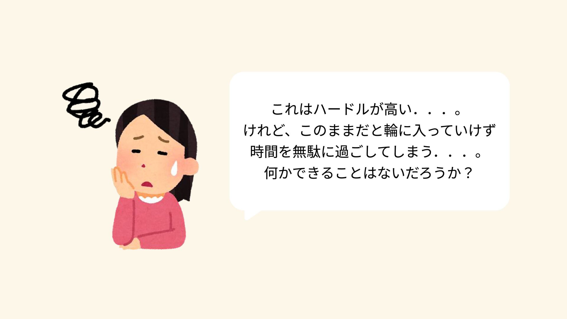 これはハードルが高い...。 けれど、このままだと輪に入っていけず 時間を無駄に過ごしてしまう...。 何かできることはないだろうか?