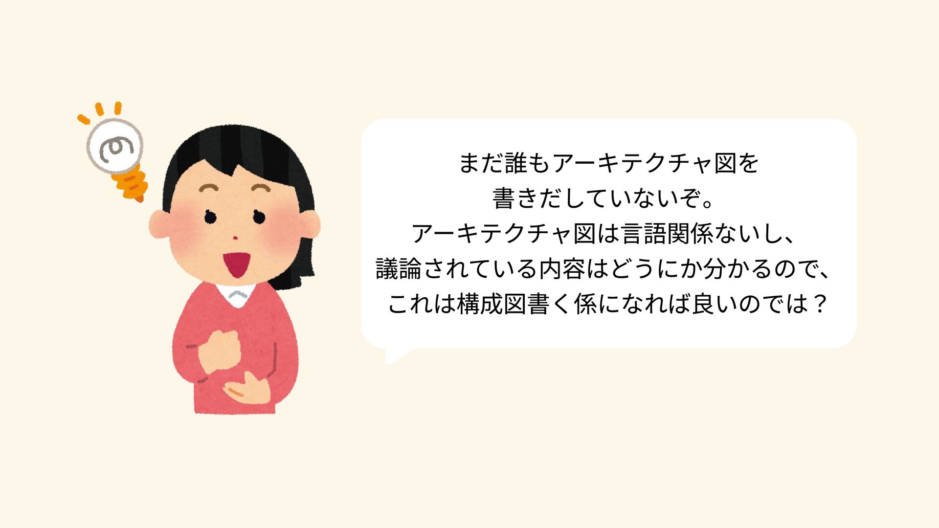 まだ誰もアーキテクチャ図を 書きだしていないぞ。 アーキテクチャ図は言語関係ないし、 議論されている内容はどうにか分かるので、 これは構成図書く係になれば良いのでは?
