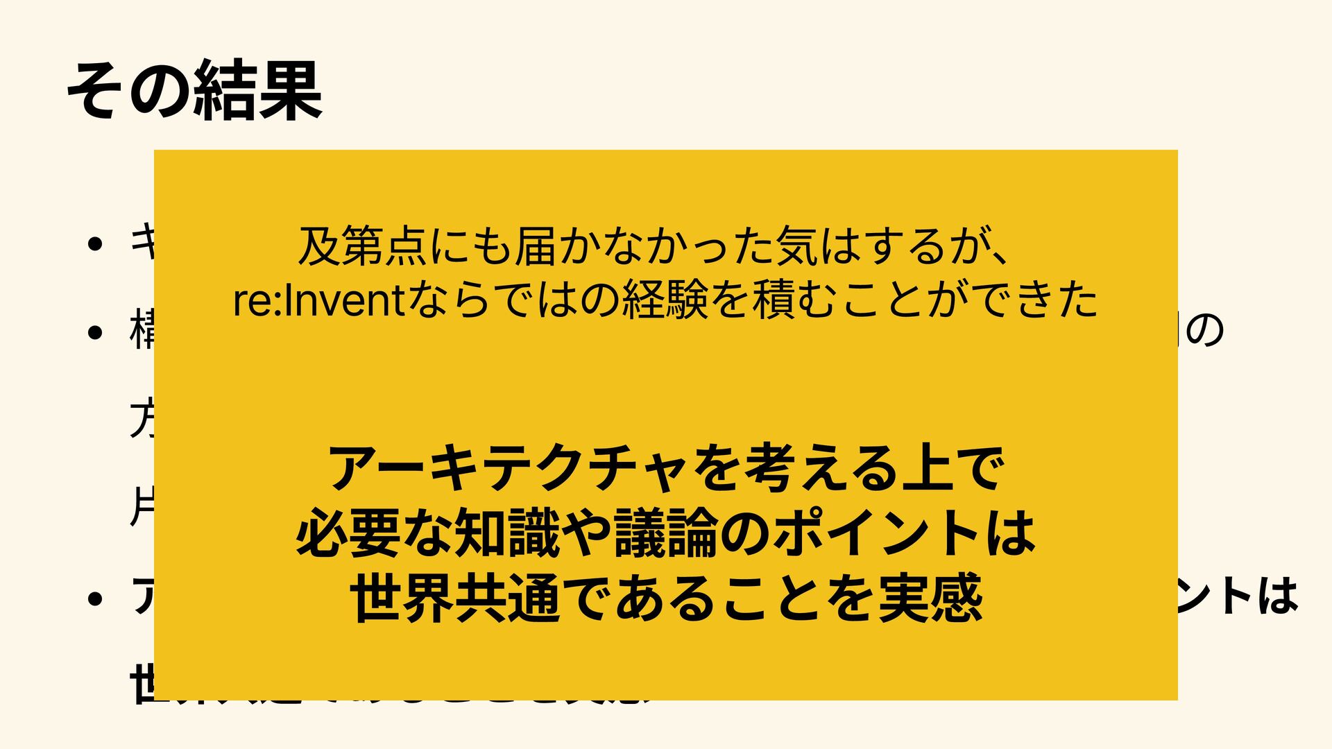 その結果 ギリギリ輪に入ることに成功! 構成図を書く過程で出てくる諸々(サービスのAZ利用の 方針、サブネット分割、などなど)について、 片言ながら会話しながら進めることができた アーキテクチャを考える上で必要な知識や議論のポイントは 世界共通であることを実感 及第点にも届かなかった気はするが、 re:Inventならではの経験を積むことができた アーキテクチャを考える上で