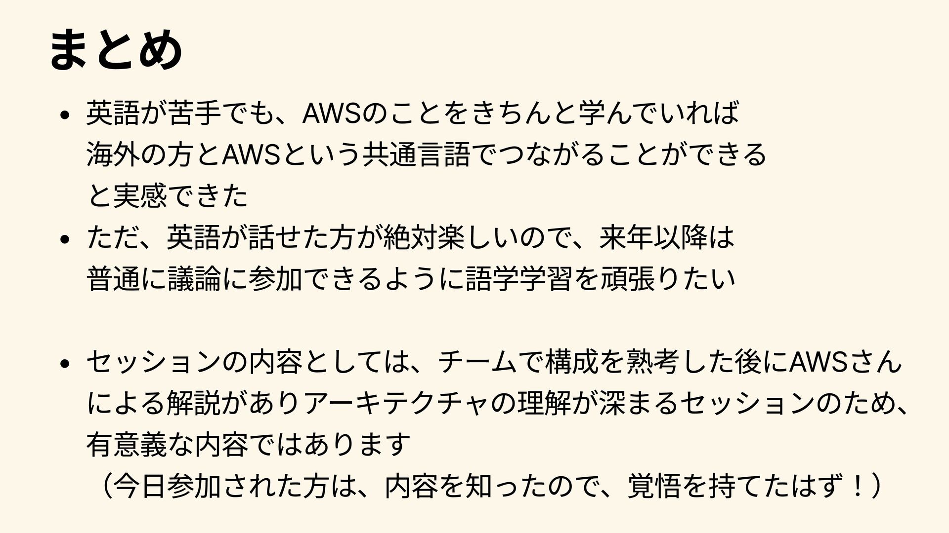まとめ 英語が苦手でも、AWSのことをきちんと学んでいれば 海外の方とAWSという共通言語でつながることができる と実感できた ただ、英語が話せた方が絶対楽しいので、来年以降は 普通に議論に参加できるように語学学習を頑張りたい セッションの内容としては、チームで構成を熟考した後にAWSさん による解説がありアーキテクチャの理解が深まるセッションのため、 有意義な内容ではあります (今日参加された方は、内容を知ったので、覚悟を持てたはず!)