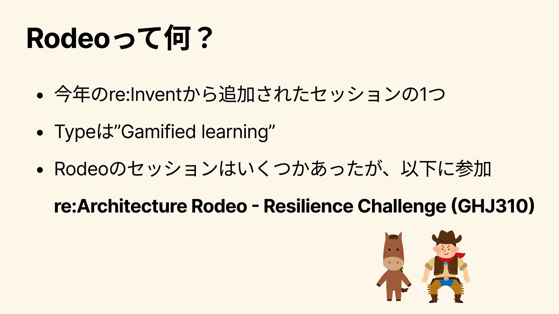 Rodeoって何? 今年のre:Inventから追加されたセッションの1つ Typeは”Gamified learning” Rodeoのセッションはいくつかあったが、以下に参加 re:Architecture Rodeo - Resilience Challenge