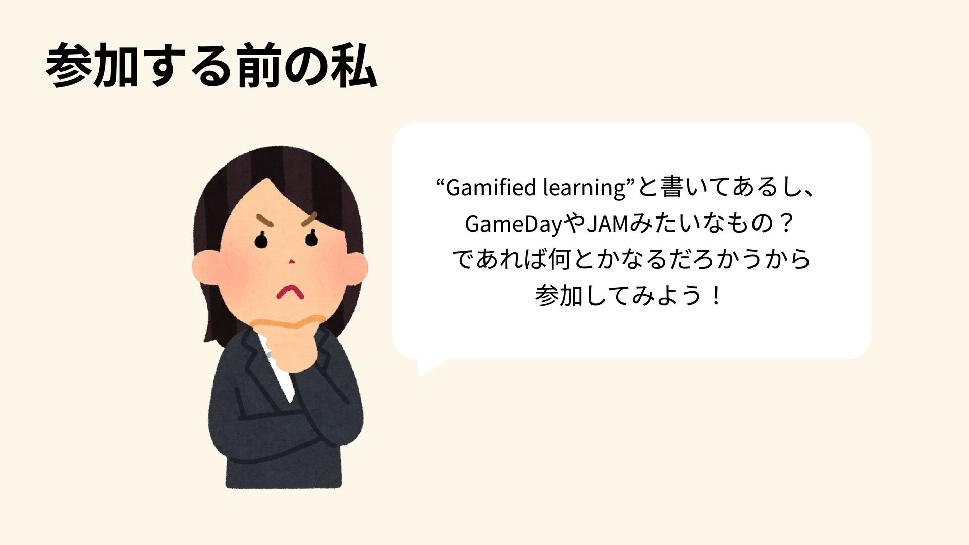 参加する前の私 “Gamified learning”と書いてあるし、 GameDayやJAMみたいなもの? であれば何とかなるだろかうから 参加してみよう!