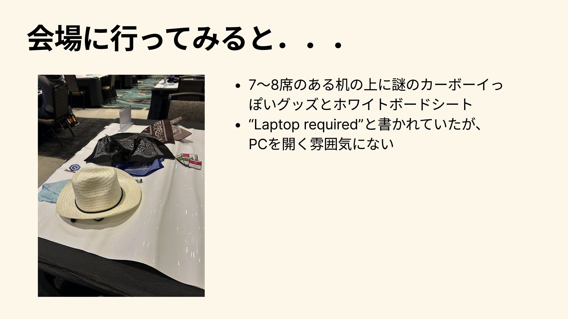会場に行ってみると... 7~8席のある机の上に謎のカーボーイっ ぽいグッズとホワイトボードシート “Laptop required”と書かれていたが、 PCを開く雰囲気にない