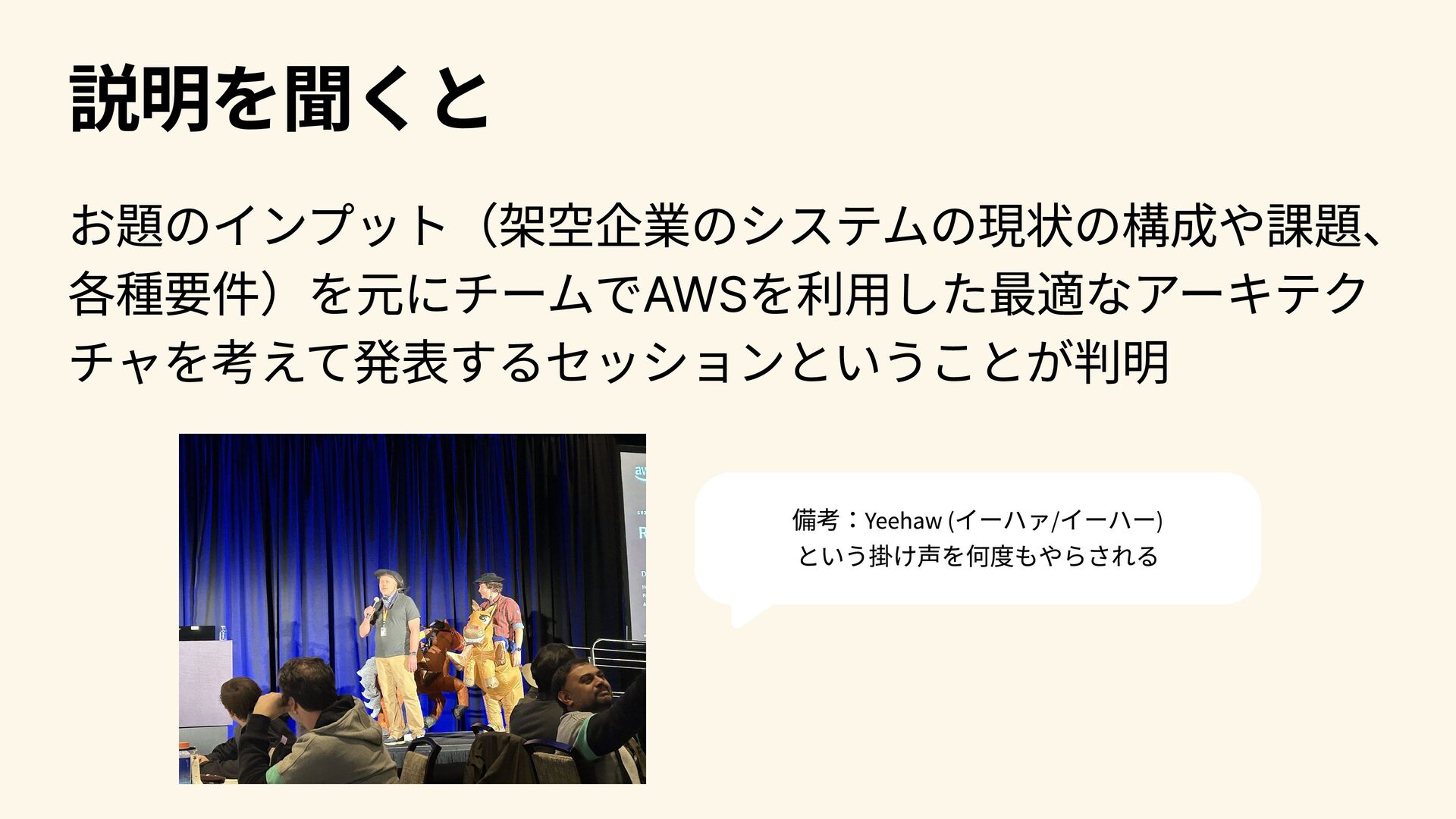 説明を聞くと お題のインプット(架空企業のシステムの現状の構成や課題、 各種要件)を元にチームでAWSを利用した最適なアーキテク チャを考えて発表するセッションということが判明 備考:Yeehaw (イーハァ/イーハー) という掛け声を何度もやらされる
