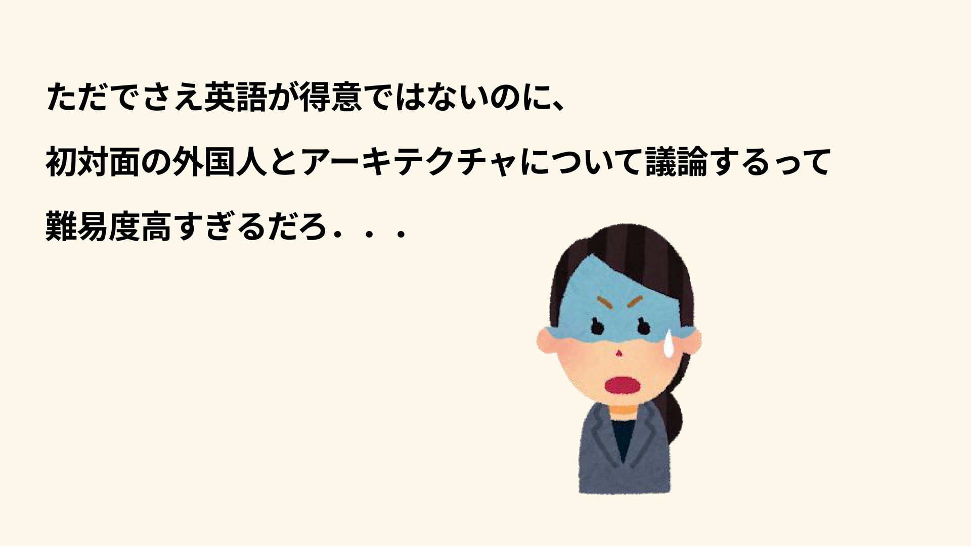 ただでさえ英語が得意ではないのに、 初対面の外国人とアーキテクチャについて議論するって 難易度高すぎるだろ...