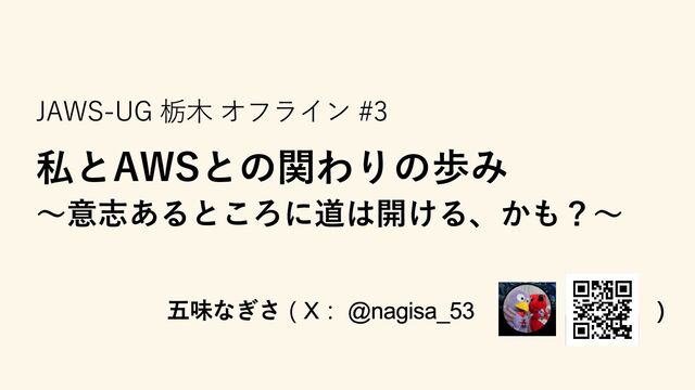 AWSと 出会う AWSで構 築した大 規模シス テムのリ リース オンプレ もやりつ つAWSの 仕事 目標とな る存在 だった上 司が会社 を辞める 担当顧客 の変更 (仕事で AWSから 離れる) 反抗の結 果?一人 チームが 立ち上が る チームご と別事業 部に。 チームが 二人にな る。 パブリッ ククラウ ド推進グ ループの リーダに 業務は引 き続き。 AWS Summit 初出展。 JAWS-UG オンライ ン初参加 オフライ ン初参加。 その足で JAWSの運 営に。 JAWS初登 壇 二支部目 の運営に ジョイン その他 re:Invent に初参加 社内コ ミュニ ティ立ち 上げ 社内初 ALL Cert 表彰を受 ける 社内初 Top Engineer 表彰を受 ける 社内初 AWS CBs, AWS Ambassad orになる