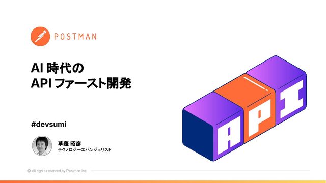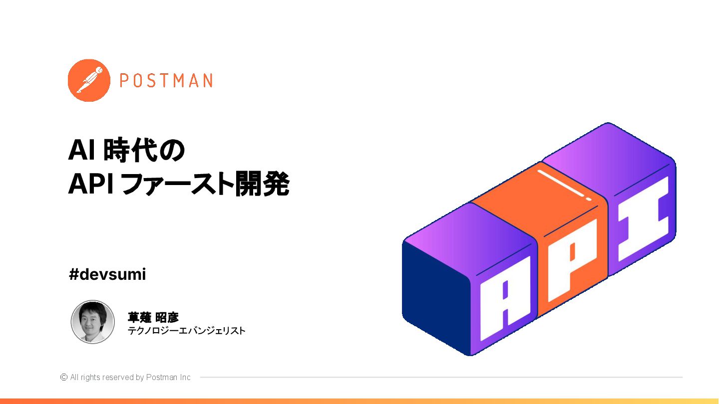 LLMの普及によりアプリケーションへのAI導入が活発になっている一方で、APIの重要性がこれまで以上に高まっています。本講演では、AIの手足として機能するための「AI-Ready」なAPIが求められている中、有用な指針となる「APIファースト」開発のコンセプトを振り返るとともに、AI特有の考慮ポイントも合わせて解説します。2025年12月22日発売の書籍「APIファースト Postmanで学ぶ効率的かつ柔軟な開発アプローチ」(川崎 庸市・草薙 昭彦 著、翔泳社)のエッセンスも凝縮してお話しします。Developers Summit 2026での発表資料です。