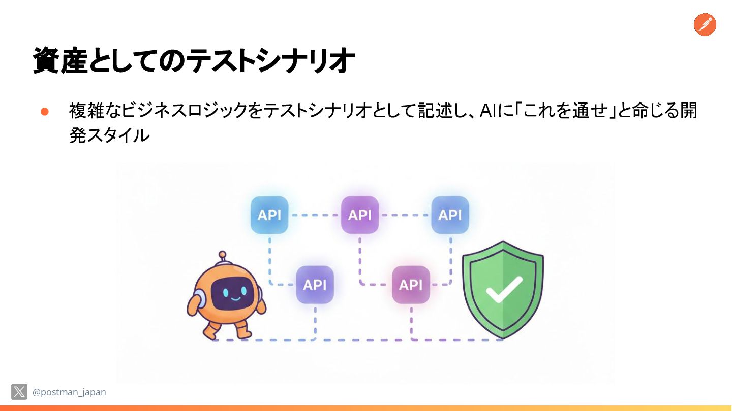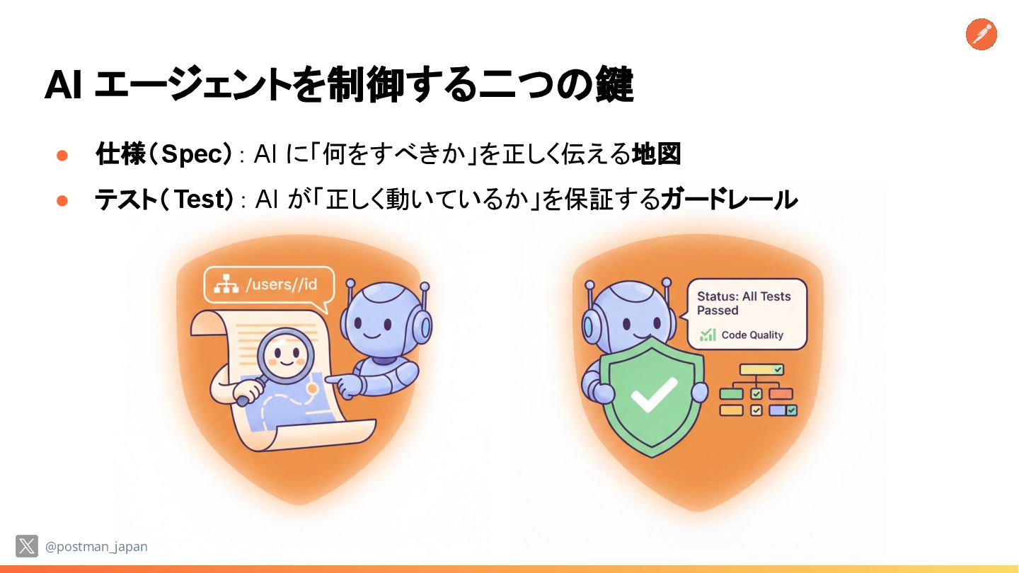 5. 非決定的な AI を、決定的な仕様とテストで制御する • 曖昧な仕様をテストケースで縛ることで、AI エージェントおよび AI が生成した実装 の誤操作を論理的に遮断する @postman_japan