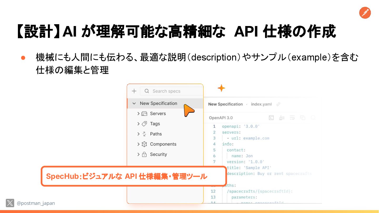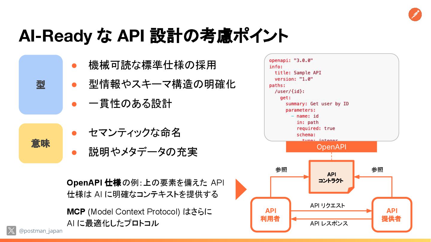 • セマンティックな命名 • 説明やメタデータの充実 @postman_japan API コントラクト API 提供者 API 利用者 API リクエスト 参照 参照 API レスポンス OpenAPI 型 意味 OpenAPI 仕様の例:上の要素を備えた API 仕様は AI に明確なコンテキストを提供する MCP (Model Context Protocol) はさらに AI に最適化したプロトコル