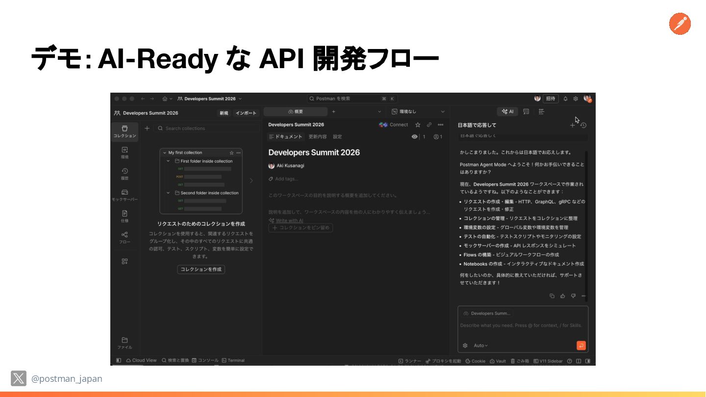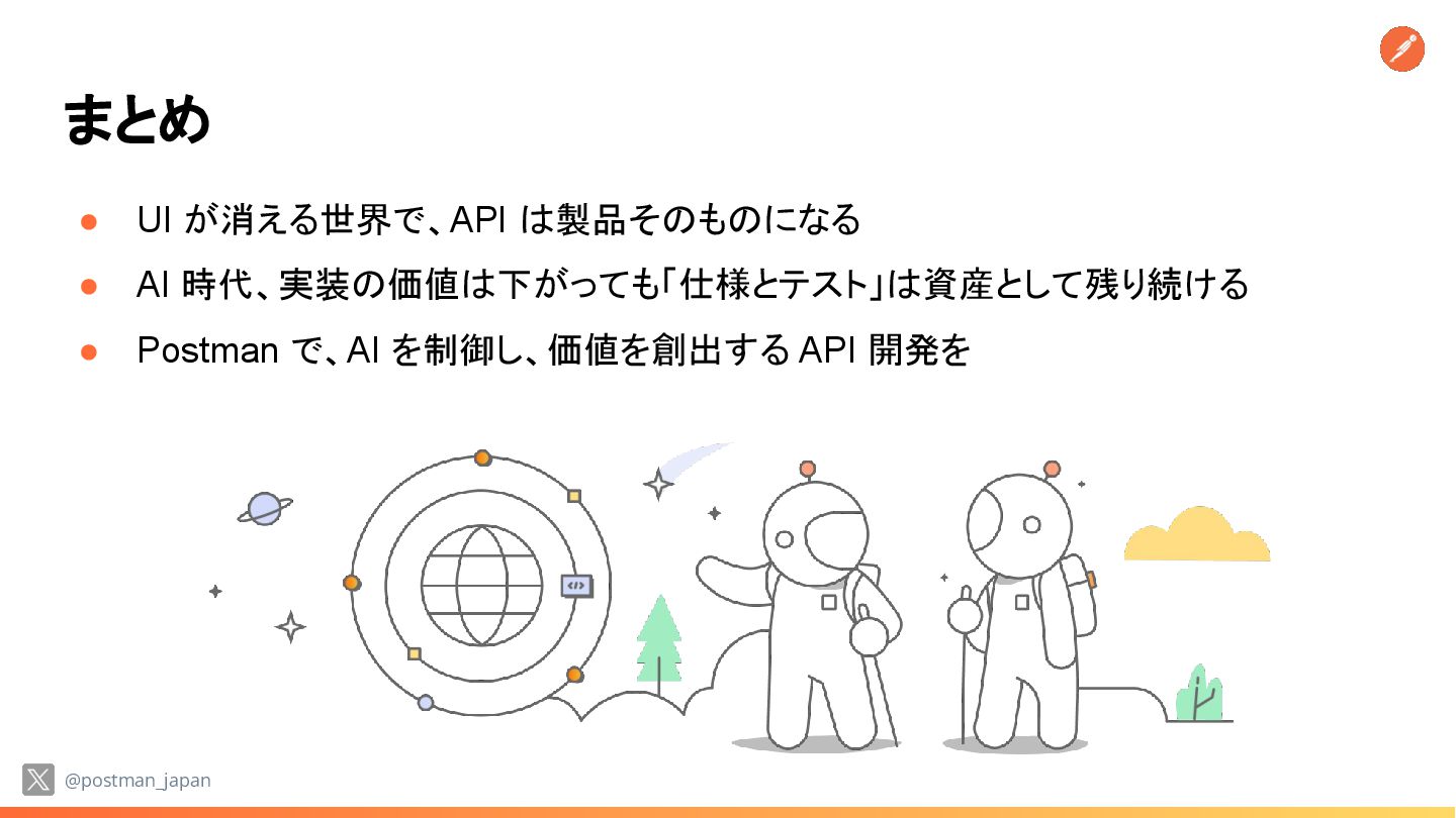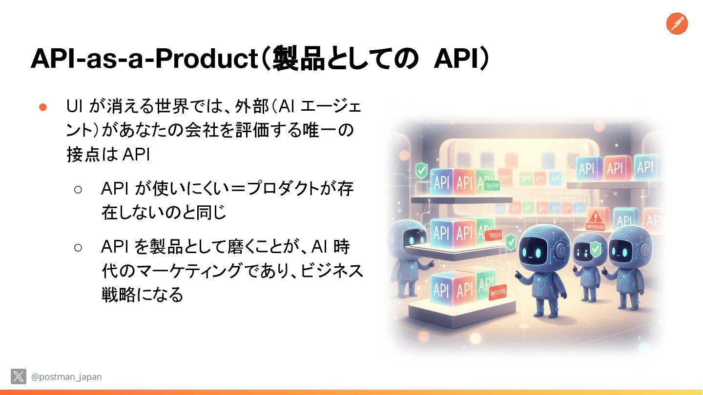 API が使いにくい=プロダクトが存 在しないのと同じ ◦ API を製品として磨くことが、AI 時 代のマーケティングであり、ビジネス 戦略になる @postman_japan
